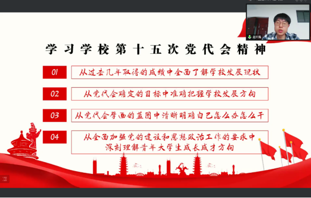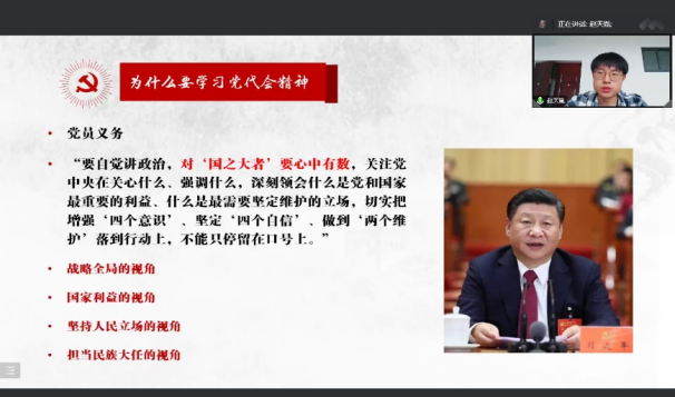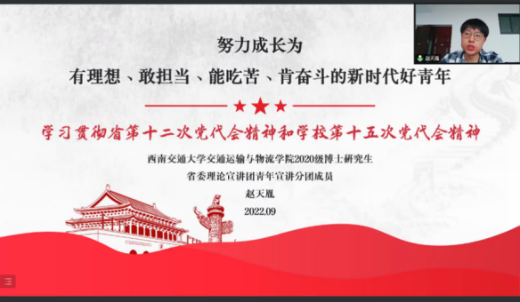 一个有远见的民族,总是把关注的目光投向青年;一个有远见的政党,总是把组织的基础植根于青年。为深入学习贯彻太阳成tyc7111cc第十五次党代会精神,指引青年老员工成长成才方向,太阳成tyc7111cc团委邀请四川省委宣讲团新时代文明实践青年宣讲分团团成员、太阳成tyc7111cc青年讲师团成员赵天胤为“青马工程”精英班、骨干班成员、研究生会、员工会全体员工干部和2022级新生举办线上专题报告会。为落实属地疫情防控要求,报告会采取线上形式召开。