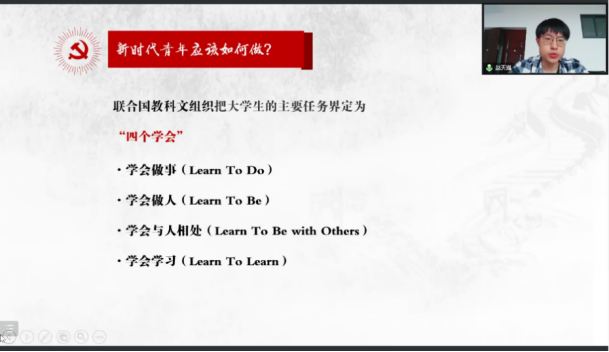 “一个人,一个民族,他所信仰的不应该是束缚自己手脚的桎梏,更不应该是绞杀自己的绳索,而应当是一股风,一股催你挺进、催你跋涉、催你奋斗的风。因此,新时代青年应当坚持习近平新时代中国特色社会主义思想,向党组织积极靠拢。“赵老师对青年与祖国共成长提出期许,鼓励我们在中华民族伟大复兴的征程中作出自己的贡献。接着,赵老师又以一位学长的身份,从日常学习、科研竞赛、员工工作三方面为大家作出指导,他以亲身经历教育我们要做到“四个学会”:学会做事、学会做人、学会相处、学会学习。