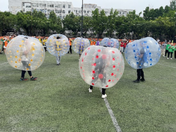 手举皮球,蜈蚣竞走。选手们相互用身体前后夹着大皮球,同时双手举起另一个大皮球,在球不落地的情况下,列成纵队,向前奔跑。双脚一起一落间,共同迈进,不仅考验着选手的协调力,更考验着他们相互配合的默契度。
