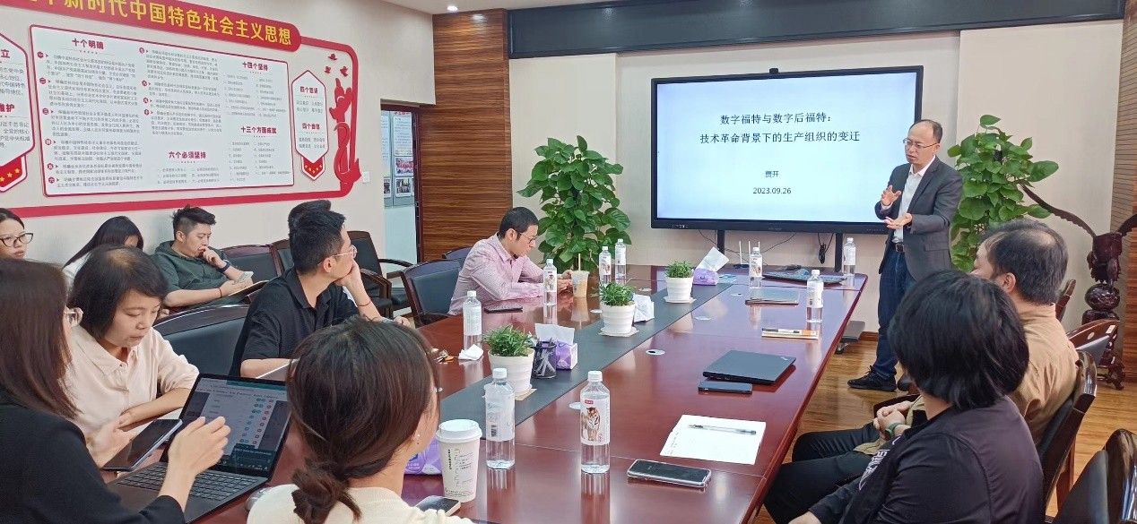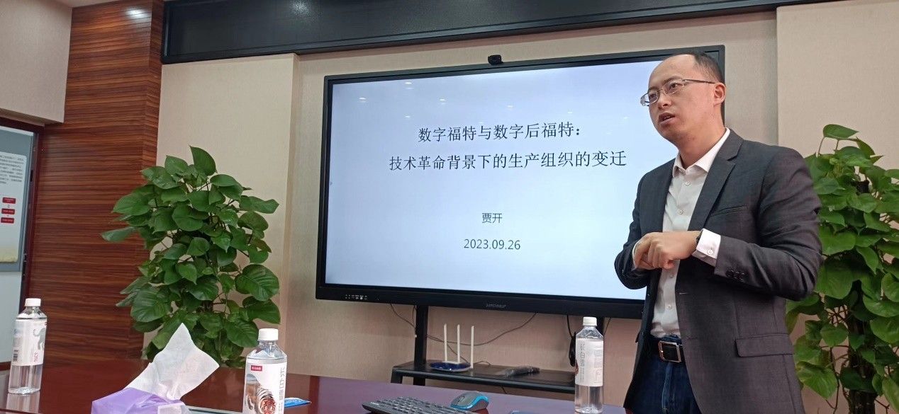 2023年9月26日下午2点,国家治理“镜湖”论道第14期学术沙龙在公司01212会议室隆重举行。本期活动邀请到清华大学博士、富布莱特学者,电子科技大学太阳成tyc7111cc贾开副教授,以“数字福特与数字后福特:技术革命背景下的生产组织的变迁”为主题,展开学术分享。太阳成tyc7111cc彭川宇、王路昊、刘鑫、代佳欣、颜学勇、王浩宇、赵放、周贤永、徐换歌、张敖、申瑢老师,以及多位同学参与会议,王思琦老师担任本次讲座主持人。