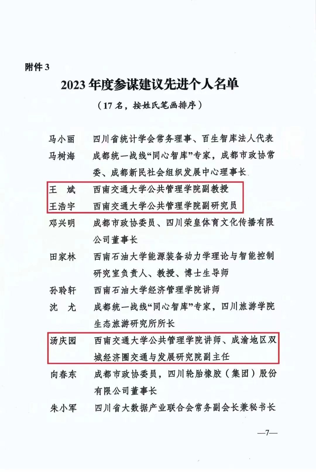 三位老师获得全市“参谋建议先进个人”荣誉,彰显出公司公共事业管理专业发展和新型智库建设的长足进步,是以西南交大新文科服务国之大者、省之大计、市之大事的生动体现。未来,公司还将以公共管理博士点申报、高层次人才培育为抓手,继续提升教师的研究水平和咨政建言能力,为中国式现代化行稳致远贡献交大公管新力量。