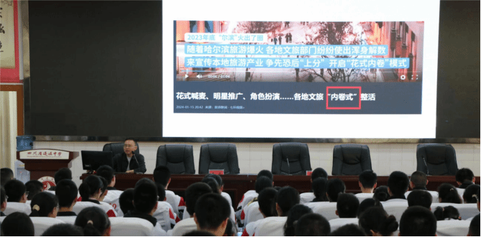 授牌仪式后,王斌老师在蓬溪中学学术报告厅举办了《反卷:理论与现实——兼论高考定向与本科规划》专题讲座。他从“内卷”这一概念的源起出发,结合员工喜闻乐见的案例,用“接地气”的语言深入浅出讲解,引起了在座同学们的共鸣。讲座的最后,王斌老师以“Fun”与“想象自我”为关键词,鼓励大家要学会舒展自我,找到自己的兴趣与热情,在广阔天地中施展抱负、勇毅前行。