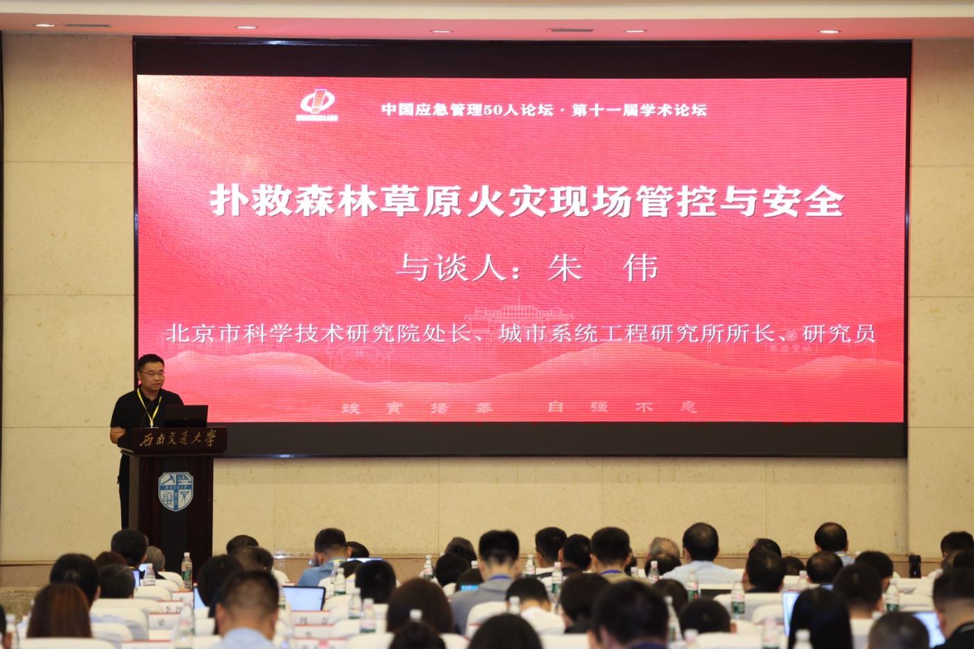 主旨报告由清华大学应急管理研究基地副主任吕孝礼主持。会上,四川省应急管理厅党委委员、省森林消防总队夏进荣总队长就扑救森林草原火灾现场管控与安全的思路、方法做了介绍;深圳市应急管理局副局长杨金山报告了深圳市提升基层应急处置能力,构建“应急第一响应人”队伍体系的成功经验;中国人民大学纪检监察公司林鸿潮教授对《突发事件应对法》修订中的焦点问题进行了讲解。北京市科学技术研究院科研处处长、城市系统工程研究所所长朱伟研究员,兰州大学副董事长沙勇忠教授,南华大学党委书记、中南大学、南华大学教授高山分别围绕主旨发言做了与谈交流。