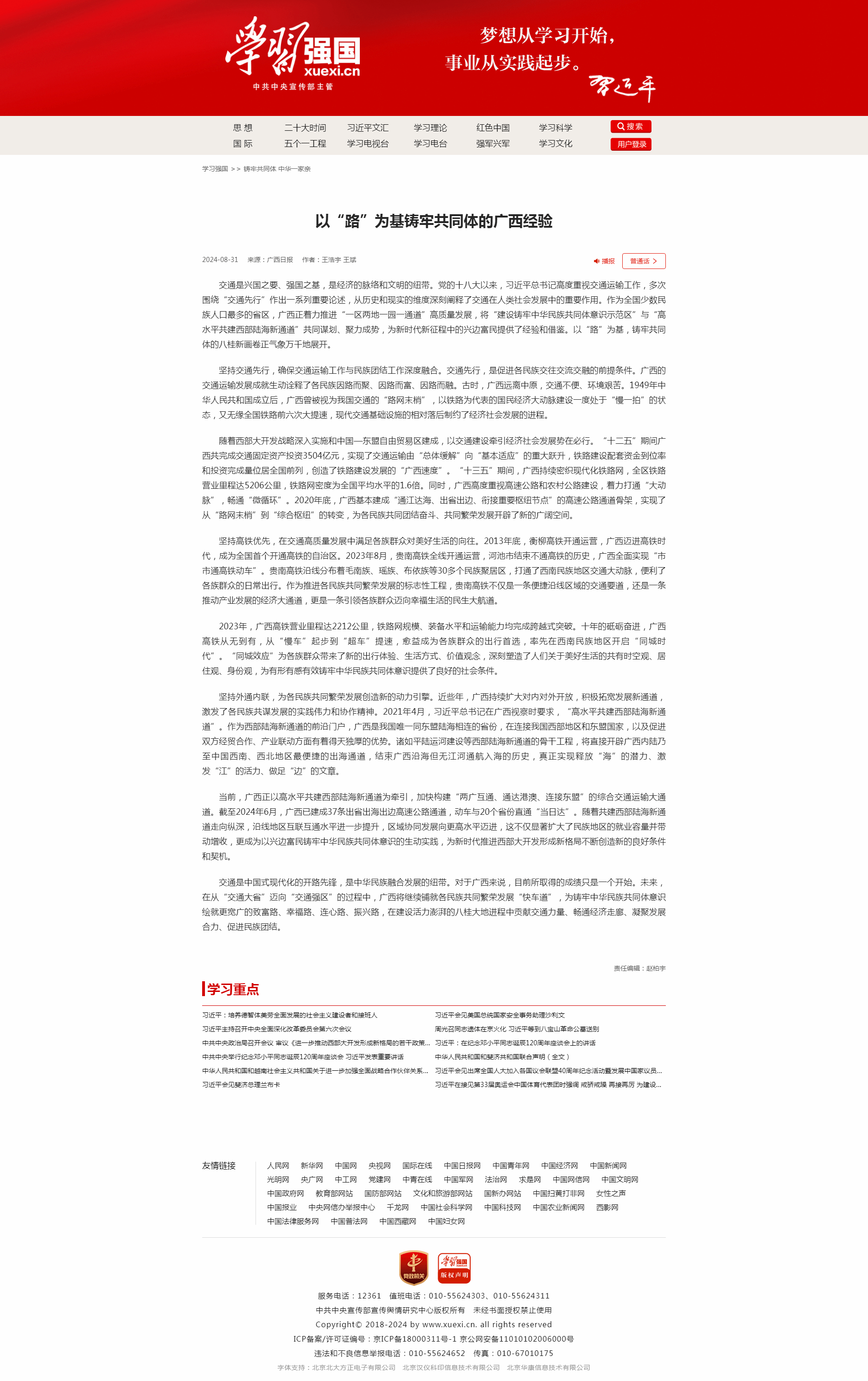 近日,公司王浩宇、王斌老师在《广西日报》(2024年8月31号)发表的评论文章《以“路”为基铸牢共同体的广西经验》,被“学习强国”全文转发,现阅读量已达170万,获得良好社会影响力。