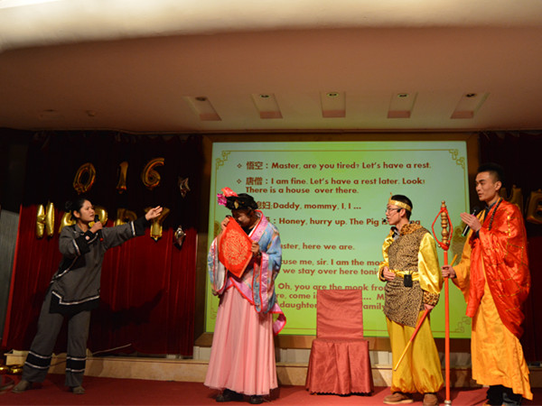 整个晚会精彩纷呈,高潮迭起,表演形式丰富多样,内容新颖。戏谑、滑稽的《三句半》,讲述新生初来乍到所见、所闻,获得了场下观众的一致好评;妙曼的摩登舞《月半小夜曲》旋律动人,用舞蹈的艺术诠释乐曲深深的哀愁;员工工作组的老师们也为晚会献唱一曲《异乡人》,让同学们看到了老师们不一样的面貌,纷纷献花鼓掌。小品《猪八戒背媳妇儿》英文版笑点十足,猪八戒人物形象实在令人捧腹,表演到位,让人拍手,将整个晚会推向高潮;合唱《红蜻蜓与斗牛士之歌》悠扬、高亢,连微信墙也被观众们的赞美刷屏;深情的诗朗诵《有一种爱情叫做民国》优美、感伤,使场下观众感动的热泪盈眶,富有情感的表演也将人们带入了民国时代。