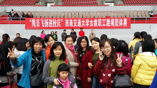 2016年3月8日14点,由校工会、体育部主办的纪念“三八”国际劳动妇女节106周年,全校女教职工跳长绳团体赛在犀浦校区北区体育场举行,全校各部门工会女教职工积极、踊跃参与,以饱满的爱校情怀和抖擞的精神面貌迎接公司120周年校庆。出席此次活动的嘉宾有公司党委副书记陈志坚,校工会主席罗乾超,副主席郑江、盛鹏,体育部副主任刘江,各二级部门工会主席、参赛队领队及运动员。公共管理与政法公司副书记余小英、工会主席王崇杰、韩文丽、杨建老师、易恬、张荣荣、刘建萍、陈冬菊、赵彦辉等参加了此次比赛。
