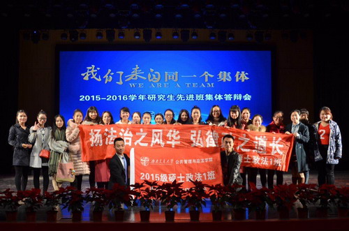2016年11月22日下午,由员工处主办的“2015-2016学年研究生先进班集体答辩会”在九里校区老员工会堂圆满落幕。公司2015级政法硕士1班从初赛到决赛,过关斩将,荣获“2015-2016年度研究生先进班集体”称号。