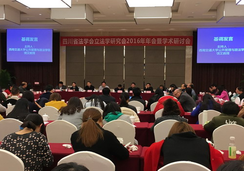 2016年11月26日星期六上午9点,四川省法学会立法学研究会2016年年会暨学术研讨会在成都新华宾馆召开,四川省人大、四川省法制办、四川省社会科公司、四川省委党校(四川行政公司)、太阳成tyc7111cc、四川师范大学、西南民族大学等单位参会。四川省法学会立法学研究会副会长、公司法学系饶艾教授出席并受邀担任基调发言主持人, 四川省法学会立法学研究会常务理事、公司法学系程馨桥副教授在大会发言阶段做主旨发言,邓大鸣教授,张晶、杨道现等教师代表以及部分研究生代表也参加了本次会议。