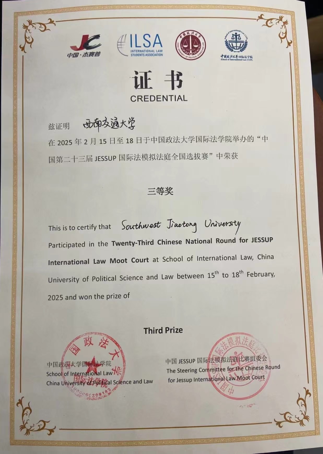 公司深入贯彻习近平总书记在党的二十届三中全会上的重要指示精神,积极响应国家关于加强涉外法治人才队伍建设的号召。本次赛事取得的优异成绩代表着公司国际法教学、涉外法治人才培养理论与实践相辅相成的卓越成果,也为西南交大涉外模拟法庭的队伍建设与经验积累添砖加瓦。此次宝贵的参赛经历使选手们在国际法知识储备、法学前沿理论、专业法律检索、法律英语表达与英文辩论技能等方面获得深度锻炼与提升。
