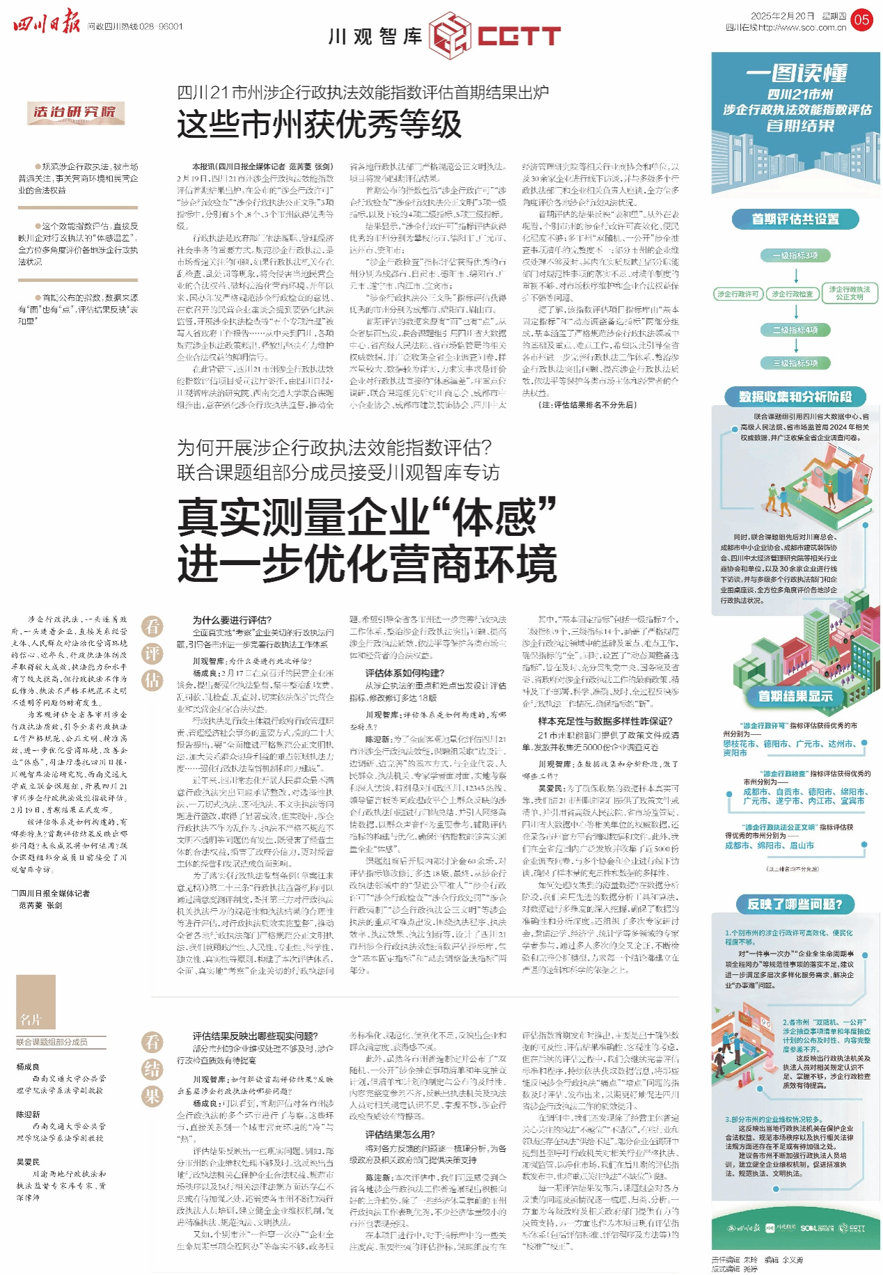 2025年2月20日,四川日报在头版将“四川21市州涉企行政执法效能指数评估首期结果出炉”的信息以倒头版的形式进行导读,并在四川日报第5版整版将首期评估结果公布,并就为何开展涉企行政执法效能评估、评估体系如何构建、评估工作如何有效开展等问题,对课题组成员杨成良副教授、陈迎新副教授和2006级法学研究生员工、资深律师吴爱民进行了专访。