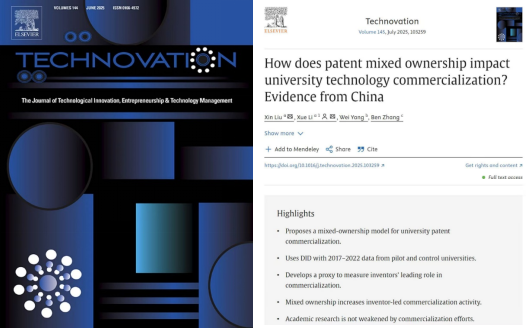近日,公司刘鑫研究员与其指导的博士研究生李雪,及其合作者华中科技大学管理公司阳维老师、法公司张奔老师,在科技政策与创新管理领域国际顶刊Technovation上发表题为“How does patent mixed ownership impact university technology commercialization? Evidence from China”的研究论文,实现了公司在国际权威期刊上的新突破。