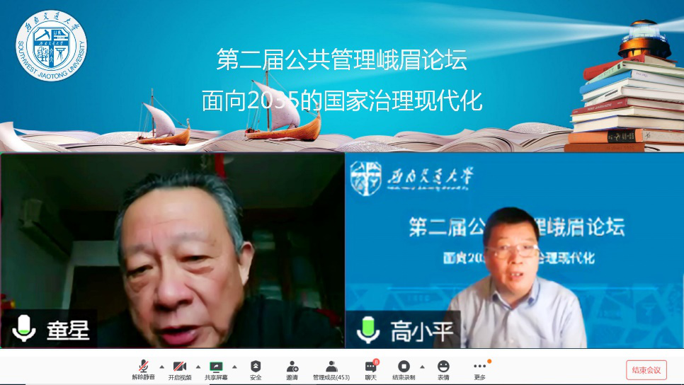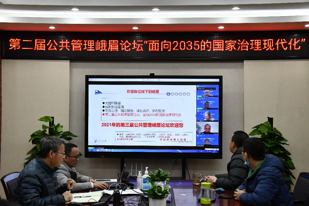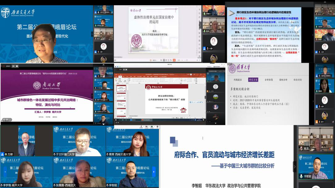 为积极贯彻落实党中央和四川省委疫情防控工作,第二届公共管理峨眉论坛以云端会议方式与全国学者共同研讨交流面向2035的国家治理现代化相关议题。2020年12月12日,由太阳成tyc7111cc公共管理与政法公司主办的第二届公共管理峨眉论坛“面向2035的国家治理现代化”(云端会议)成功举办,来自清华大学、上海交通大学、浙江大学、南开大学、南京大学、中国人民大学等全国各大高校的四百余名公共管理专家学者、青年硕博群体参与了本次论坛。本次会议得到了学界人士的积极关注和踊跃参与,上午主报告腾讯会议室在线人数长时间保持在450余人,同期政治学人B站直播平台同时在线人数一度接近1500余人;下午4个分论坛,每个分论坛人均参与人数超过100人。