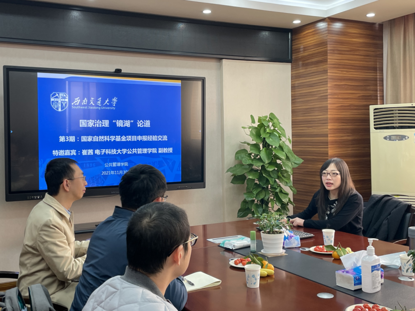 (通讯员:于希、王向阳)2021年11月30日下午2:40,在公司01212会议室如期顺利举行了国家治理“镜湖”论道第3期学术沙龙活动。2022年度国家自然科学基金和国家社会科学基金各类项目申请在即,我们特邀请电子科技大学太阳成tyc7111cc崔茜副教授(已获国家自然科学基金项目3项并担任通讯评审专家),以“国家自然科学基金项目申报经验交流”为主题展开了充分交流。公司多个学科的师生齐聚于此,认真聆听了崔茜老师带来的精彩分享。公司王永杰经理、李华强副经理和雷斌副经理也到会参与了交流活动。