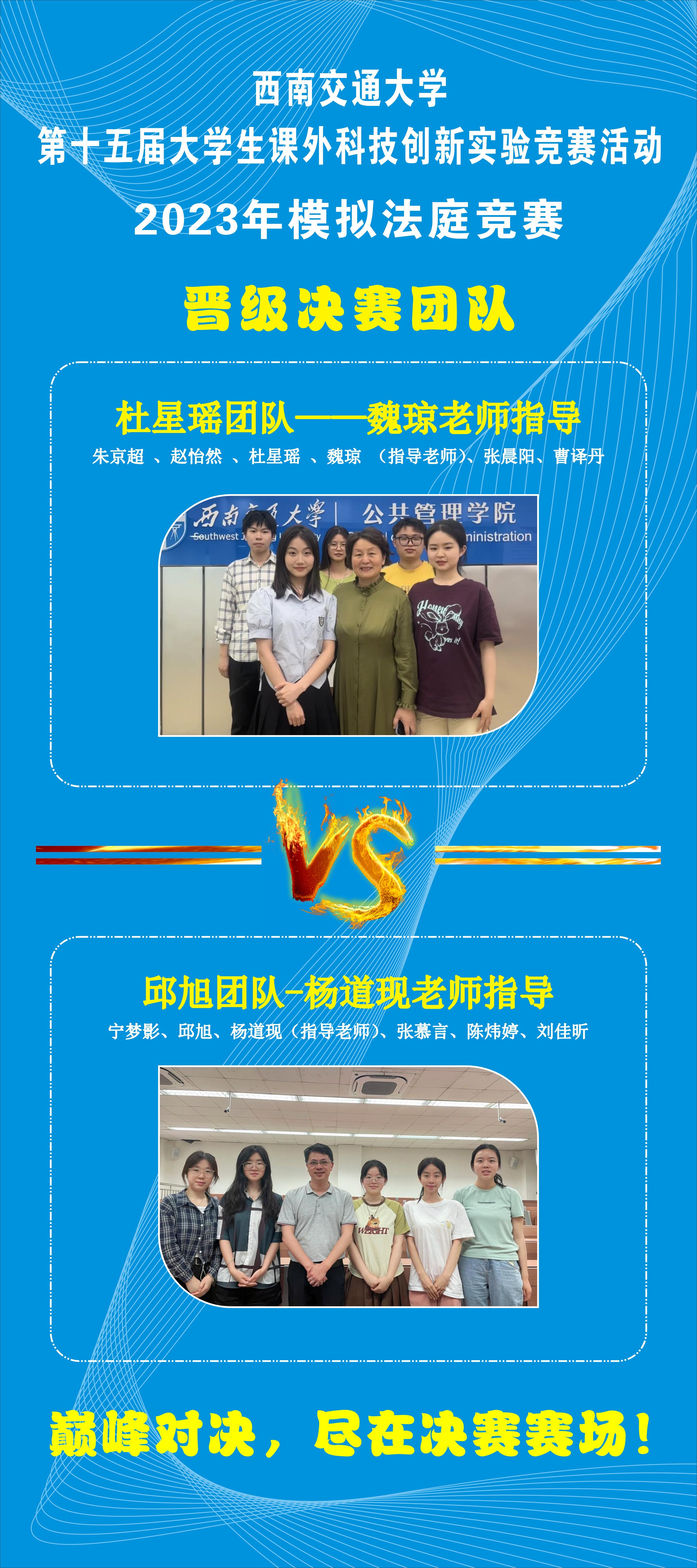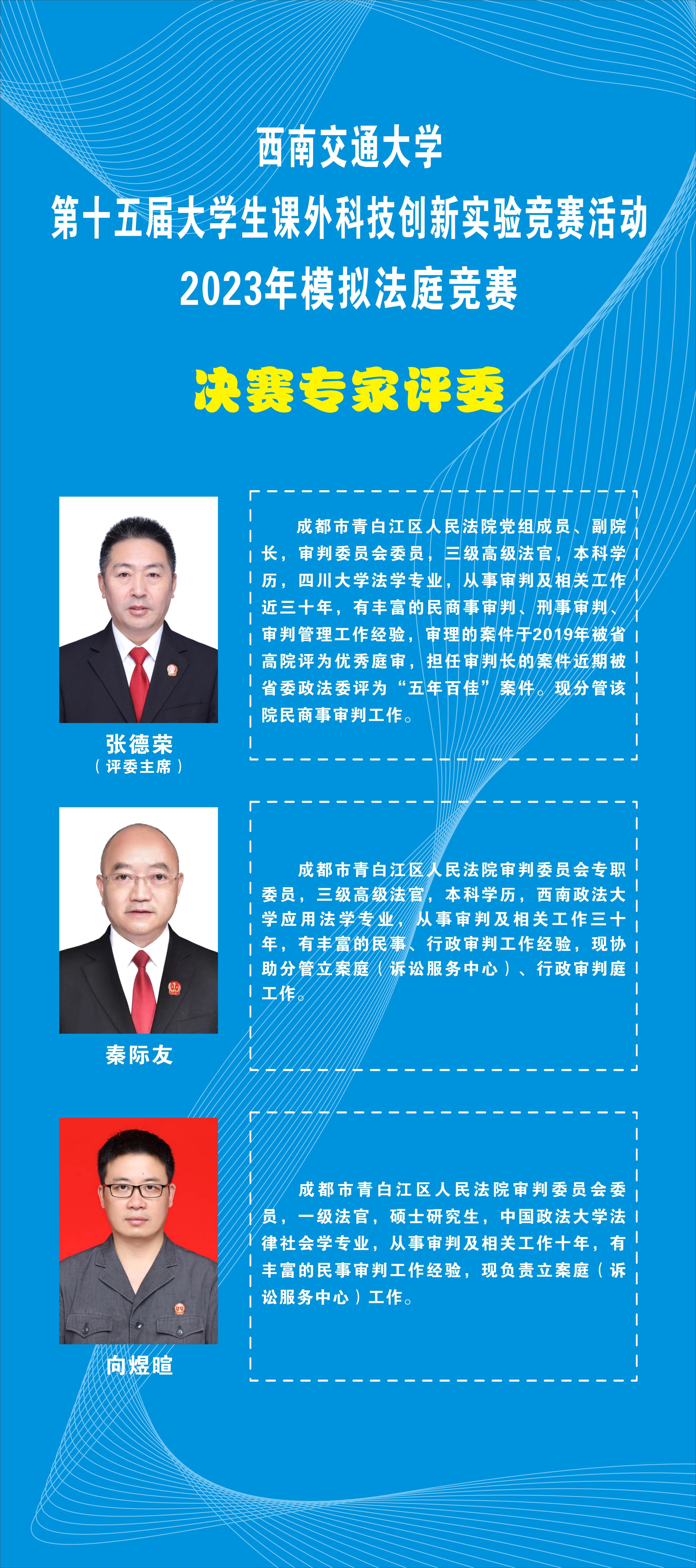 由太阳成tyc7111cc资产与实验室管理处主办,太阳成tyc7111cc、成都市青白江区人民法院、太阳成tyc7111cc团委、员工会、老员工法律协会承办的太阳成tyc7111cc第十五届老员工课外科技创新实验竞赛2023年模拟法庭竞赛在4月初拉开帷幕,经过初赛对18支参赛团队提交的司法文书进行匿名评审以及复赛对晋级的八支参赛团队言辞辩论评审,A、B两组分别有一支参赛团队晋级模拟法庭竞赛决赛,现对决赛赛事安排如下: