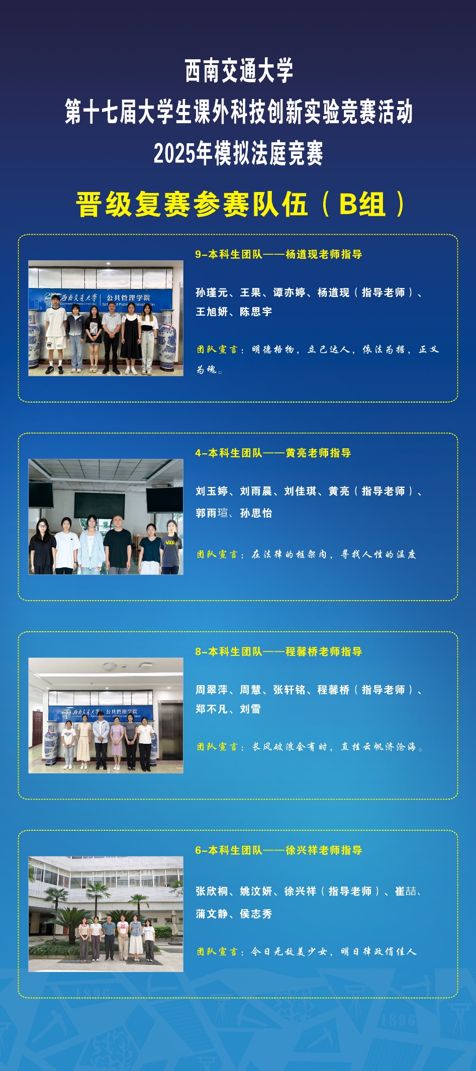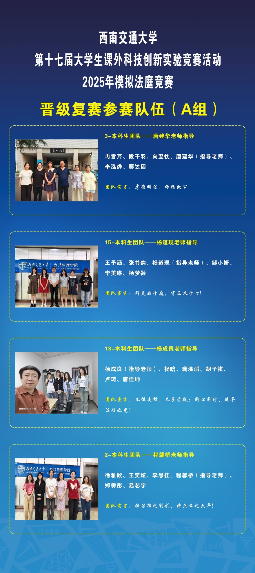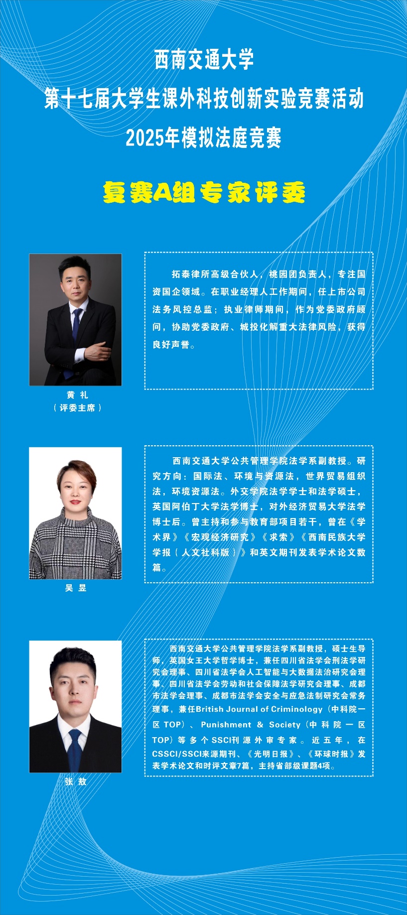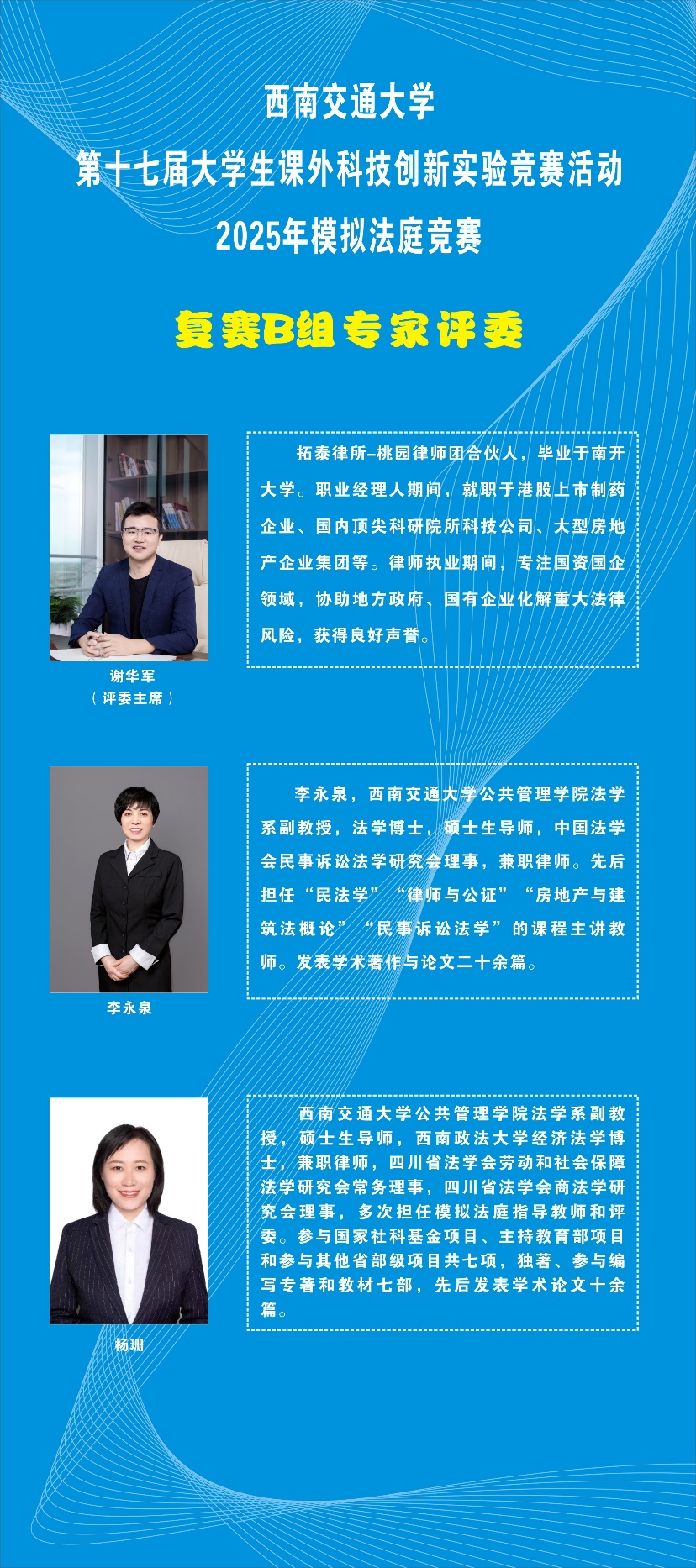 由太阳成tyc7111cc教务处、校团委主办,太阳成tyc7111cc、成都市青白江区人民法院、太阳成tyc7111cc模拟法庭实验室、太阳成tyc7111cc团委、太阳成tyc7111cc员工会、研究生会、老员工法律协会承办的太阳成tyc7111cc第十七届老员工课外科技创新实验竞赛活动2025年模拟法庭竞赛于4月初拉开帷幕。本次竞赛案例由成都市青白江区人民法院提供,公司本科生组成共17支参赛队参加了本次模拟法庭竞赛。在初赛中各参赛团队根据竞赛案例案卷材料,提交了包括民事起诉状、民事答辩状、代理词、判决书等司法文书,由青白江区人民法院三位法官进行匿名评审,8支参赛队成功晋级,现通过抽签方式,分为A、B两组展开复赛。本次模拟法庭竞赛复赛组委会特别邀请了拓泰律师事务所黄礼主任和谢华军合伙人与公司10位法学教师共同组成专家评审团进行现场评审。