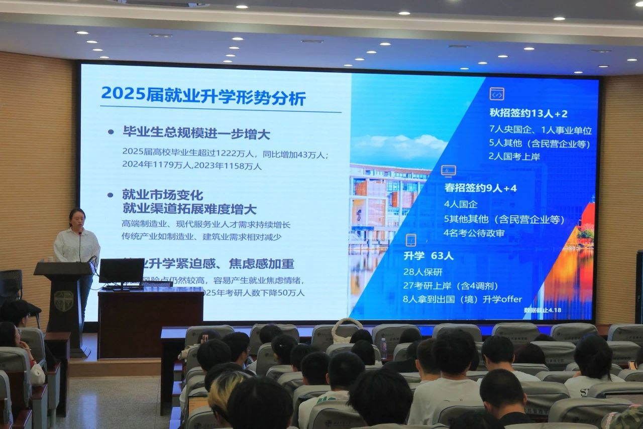 石老师首先从公司2025届员工的就业升学总体形势引入,分析当前及未来就业形势。结合2024届、2025届考研及就业详细数据,提出综合考量专业与就业匹配关系、提早做职业规划、拓展就业渠道等针对性建议;结合公司智慧就业网相关信息展示求职就业时间安排,鼓励2026届员工坚定方向、锚定目标,选择适合自己的发展道路。