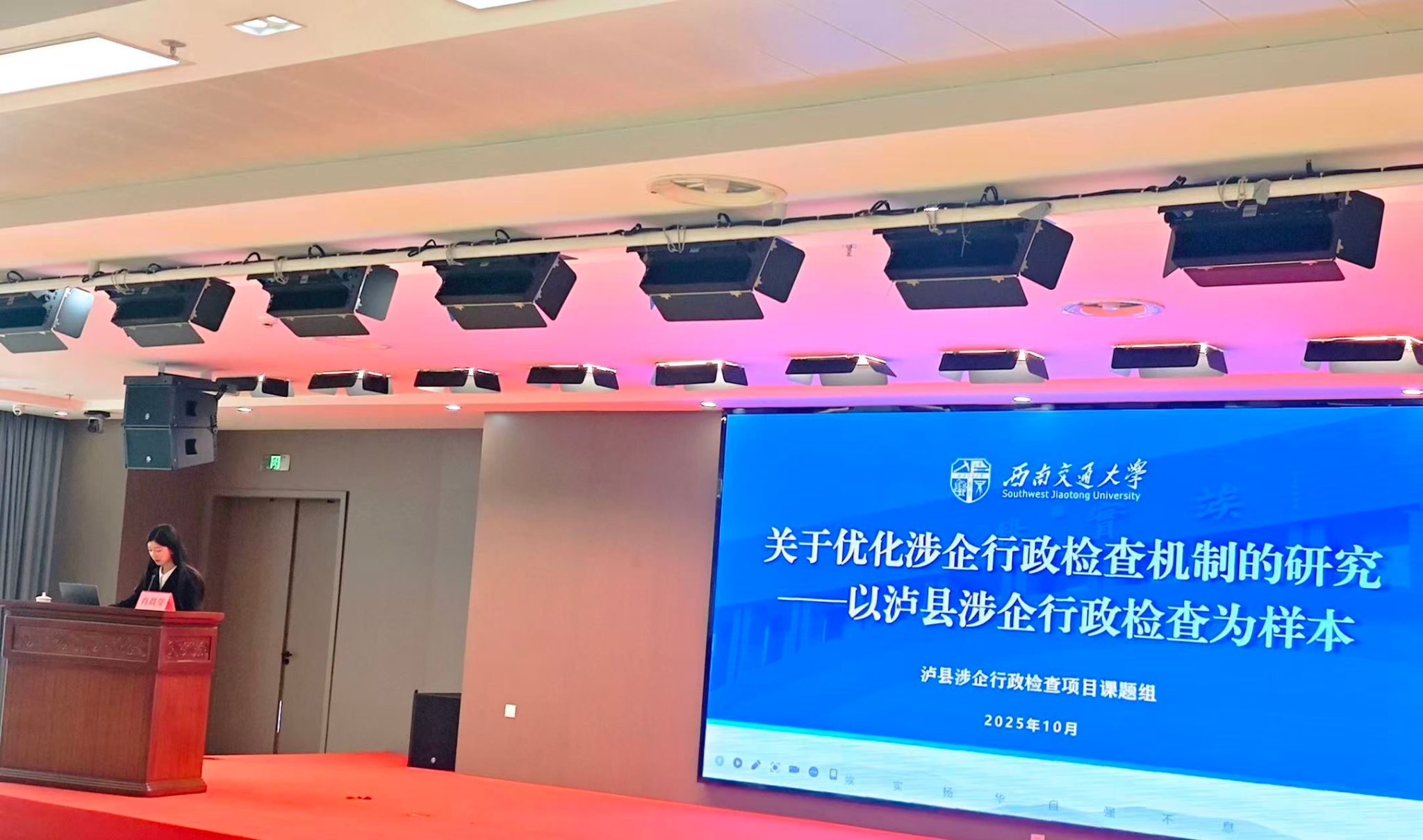 专题交流中,六位获奖作者围绕行政复议、行政诉讼等议题发言。公司法学硕士研究生肖晨莹代表联合课题组就获奖论文做学术报告,结合泸县调研数据阐述涉企行政检查困境及优化建议,获现场专家认可。