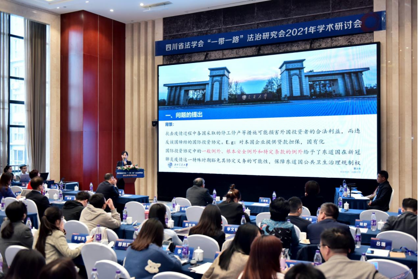 2021年10月24日,四川省法学会“一带一路”法治研究会2021年学术研讨会在成都祥宇宾馆隆重召开。本次年会以“高质量共建‘一带一路’与国际法的新发展”为主题,由四川大学法公司和四川自由贸易试验区人民法院承办。研讨会邀请了联合国国际法委员会委员、国际常设仲裁法院仲裁员、外交部国际法咨询委员会主任、资深外交官黄惠康教授,浙江外国语公司“一带一路”公司、华侨公司、国际公司执行经理陈利强教授,重庆大学法公司国际法学科带头人、博士生导师曾文革教授,四川省法学会学术部赵恒伟副主任,四川省商务厅对外经济合作处程君佳副处长,以及研究会全体副会长、秘书长、常务理事、理事,和来自政府部门、法务部门、科研院所、高校和律所的专家学者们共100余人参会。公司邓君韬副教授、吴昱副教授、张倩雯博士应邀参会,法学硕士研究生张文艺、李佳妮随同参会学习。