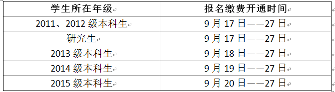 2015年9月17日-9月27日(根据不同年级,安排如下,另因考场容量有限,公司将根据缴费时间先后顺序依次满足,报满即止)。
