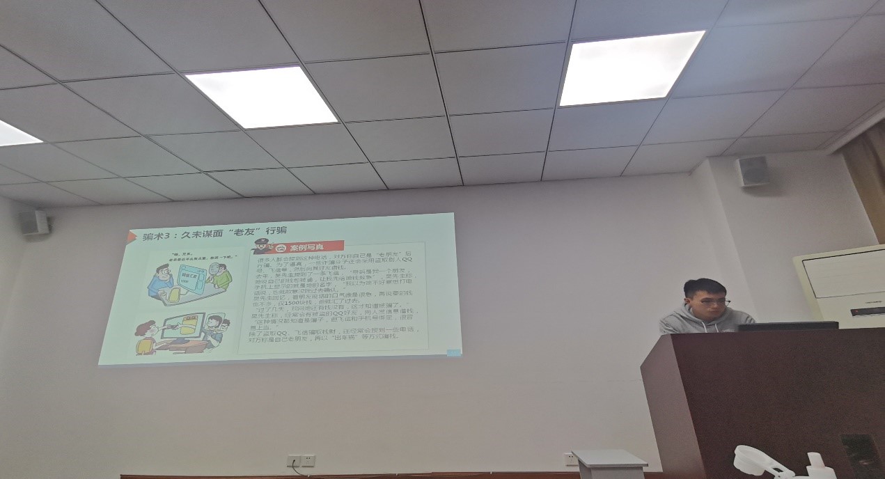 其次由班长进行“反诈防骗”知识的讲解,主要分为四个方面:什么是网络诈骗?电信诈骗的常见形式?如何防范电信诈骗?上当后的补救措施等。班长以喜闻乐见的“故事会”形式,生动讲述了常见的诈骗形式,重点针对网络刷单、投资理财、冒充身份等几类高发类型诈骗方式,力求体现趣味性、故事性和服务性,让反诈防骗入脑入心,增强知识在同学们心中的印象。其从社会上现存的诈骗方式和员工上当受骗案例等方面进行讲解,这一个个鲜活的案例告诉了党员同志们要提高防范意识,谨防受骗,鼓励同学们下载“国家反诈中心app”,进一步增强了同学们对诈骗手法的辨识度,更好地保护人身及财产安全。
