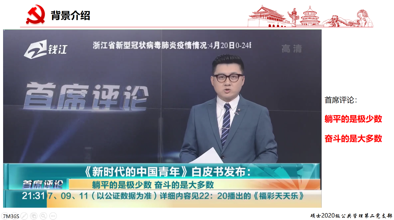在背景介绍部分,领学同志分享了白皮书发布的时间及意义。2022年是中国共产主义青年团成立100周年,国务院新闻办公室于4月21日发布《新时代的中国青年》白皮书。这是我国首次专门就青年群体发布白皮书,全面介绍了新时代党和政府为青年发展创造的良好条件、取得的巨大成就,充分展现了新时代中国青年奋进新征程、建功新时代的青春担当,是一部记录新时代中国青年发展事业成果、反映新时代中国青年精神风貌的重要文献。同时,通过播放的“首席评论”的视频,让我们更加明白,当今时代的青年,躺平的是极少数,奋斗的是大多数。