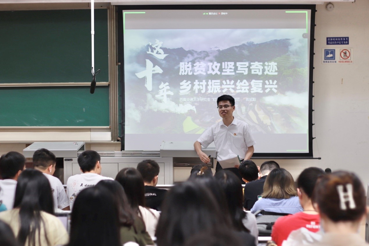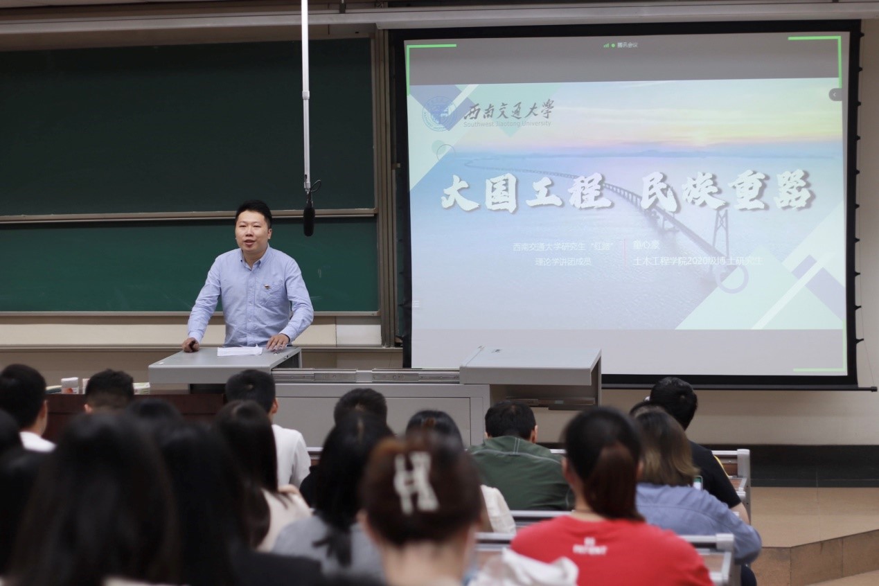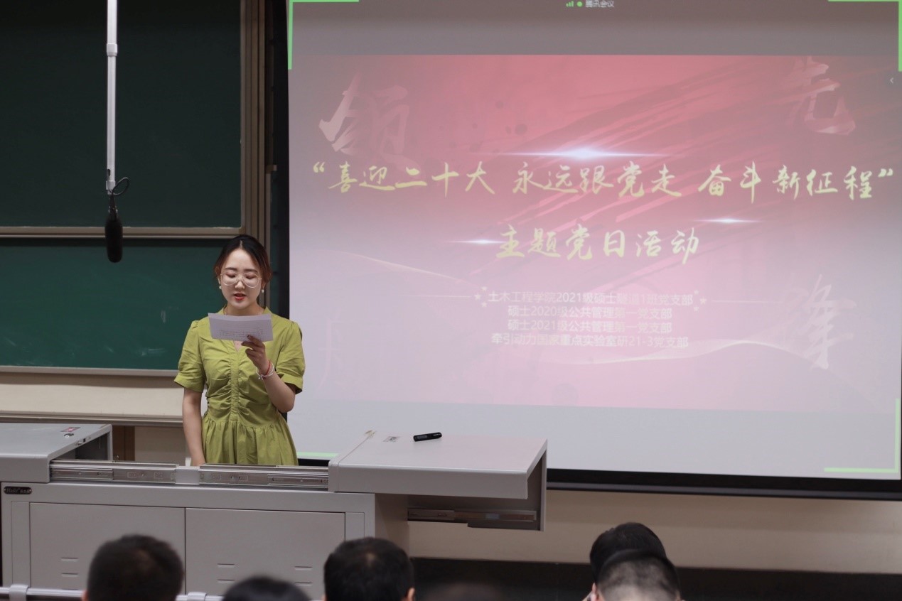 为迎接党的二十大胜利召开,深入学习贯彻习近平新时代中国特色社会主义思想,深入领会党的十八大以来党和国家事业取得的历史性成就、发生的历史性变革,2022年5月27日晚7:30,土木工程公司2021级硕士隧道1班党支部联合硕士2020级公共管理第一党支部、硕士2021级公共管理第一党支部和牵引动力国家重点实验室研21-3党支部于J4323共同开展研究生党建“领航先锋”工程——“喜迎二十大、永远跟党走、奋进新征程”主题党日活动。本次活动有幸邀请到三位研究生“红路”理论学讲团成员——韩沁儒、童心豪、黄斌翰为大家带来精彩的宣讲。