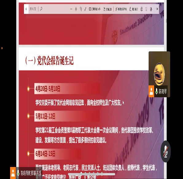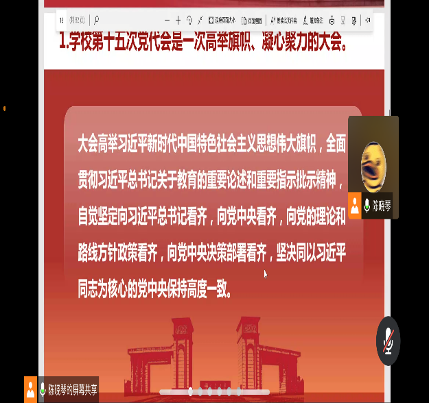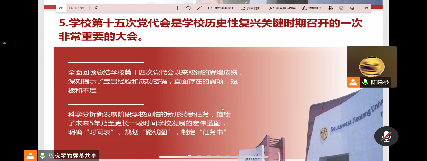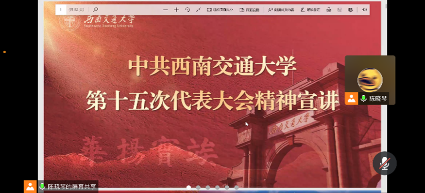学习党的理论知识是党员的义务,是坚持习近平新时代中国特色社会主义思想的内在要求。为深入学习贯彻习近平新时代中国特色社会主义思想,进一步掀起学习贯彻太阳成tyc7111cc第十五次党代会精神热潮,推进“踔厉奋发、笃行不怠,谱写中华民族伟大复兴的西南交大新篇章”主题学习教育实践活动,硕士2020级公共管理第一党支部于2022年10月13日晚19:00在腾讯会议开展“学习党代会精神,书写新青年篇章”的主题党日活动,以实际行动迎接党的二十大胜利召开。会议由党支部书记陈晓琴主持,全体党员同志参加。会议主要从大会主题、工作回顾、新时期办学治校总体思路、科学谋定公司的发展目标等方面展开。