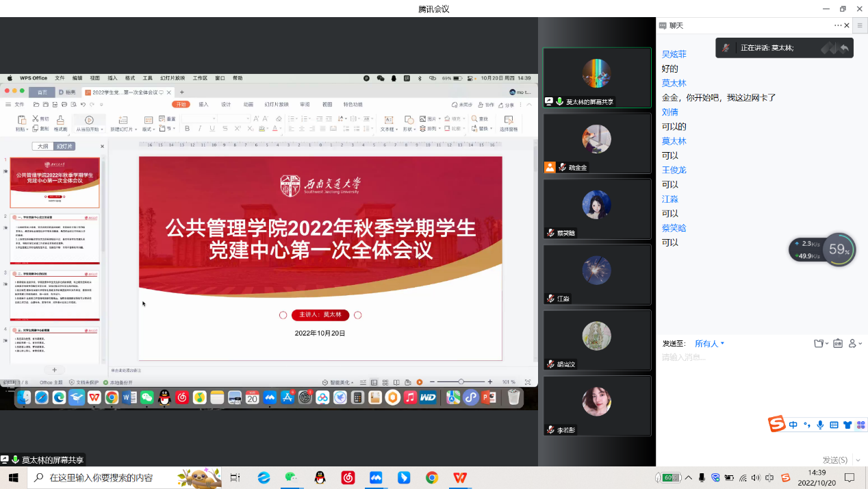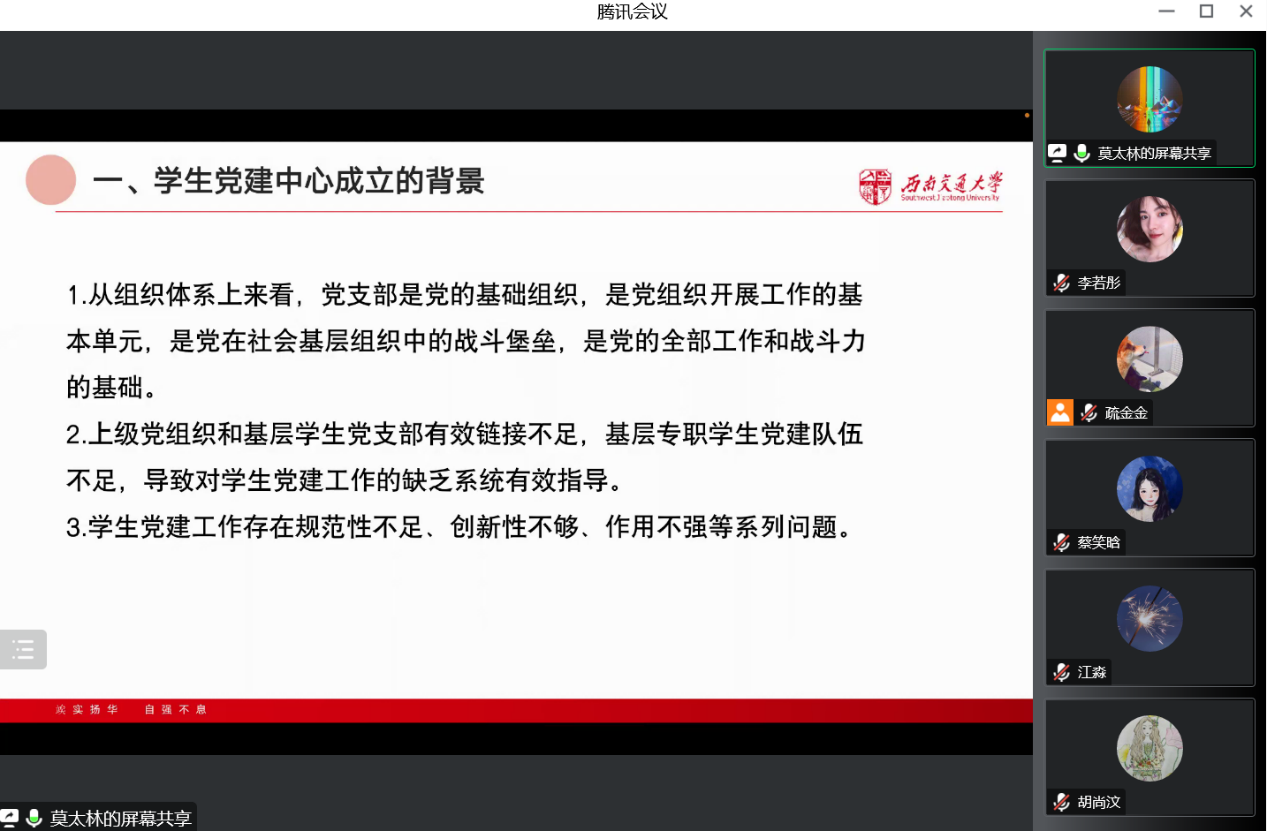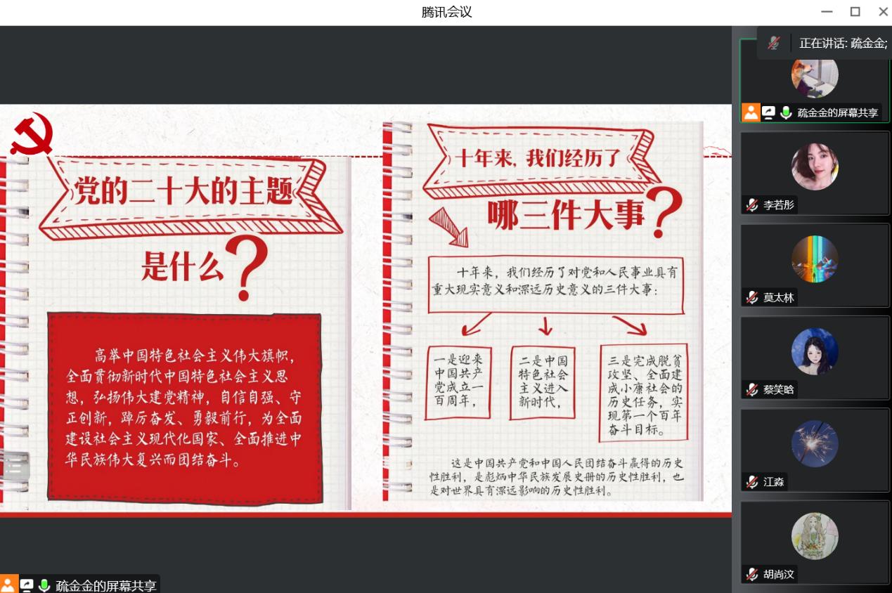 为深入学习贯彻党的二十大报告的主要内容和精神内涵,引导激励广老员工党员坚定理想信念,更好地立足岗位、履行职责,将崇尚先进、学习先进、争当先进的热情与干劲,凝聚成干事创业的力量,实现全面从严治党向纵深推进,2022年10月20日下午14:00在腾讯会议开展“太阳成tyc7111cc员工党建发展指导中心第一次全体大会”,以实际行动践行党的二十大精神。本次会议由莫太林老师主持,党建中心全体成员参加。