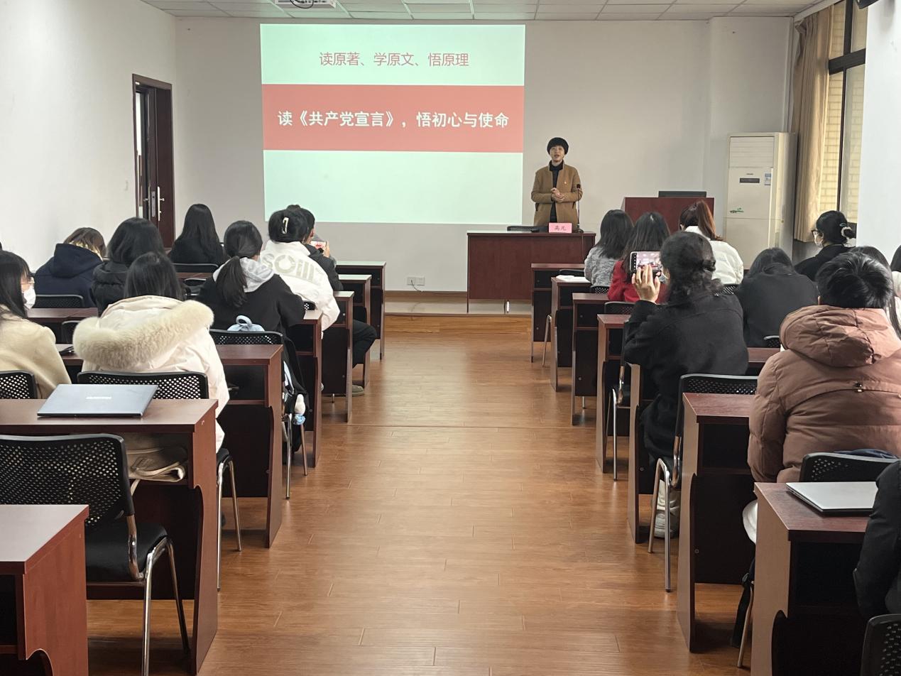随后,高凡书记接着从“读原著,学原文,悟原理”带领与会党员同志一起学习解读共产党宣言。首先,高凡书记从寻踪视角切入介绍共产党宣言的自身踪迹以及马克思主义在中国的发展。高凡书记提到,正是马克思主义中国化过程当中坚持了五个始终如一:坚持了人民立场的始终如一,坚持了历史唯物以及基本原理的始终如一和辩证,唯物法的始终如一,以及历史使命始终如一和对待马克思主义态度的始终如一,所以马克思主义在中国的发展创新才是不断向前的。然后,解读共产党宣言和共产党人的初心和使命的关系。共产党宣言的思想科学阐明了我们共产党人的崇高行为,也深刻认识了共产主义运动的科学逻辑,为中国共产党人提供了精神家园。最后,着重阐释共产党宣言的时代价值。共产党宣言科学解答了时代的基本问题,促成了社会主义从空想到科学的飞跃,历史性改变了世界格局,它是共产党员的一个精神符号,也是当代中国共产党人坚定共产主义理想信念的理论基础,是当代中国共产党人不忘初心、牢记使命的行动指南。高凡书记强调,作为研究生党员同志,应该从学习共产党宣言的过程中,通过读原著,悟原理,感悟到作为共产党员的初心使命,更加坚定自己的理想信念,牢固树立起马克思主义观。