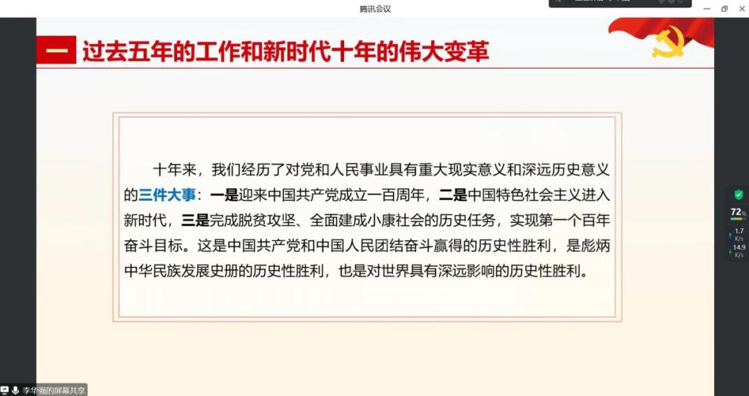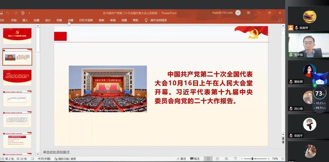 为深入学习贯彻党的二十大精神,根据公司《关于做好党的二十大精神学习培训的工作提示要求》,12月15日15:00,公司党委委员、副经理李华强在腾讯会议开展了党的二十大精神专题宣讲活动,教工机关党支部、硕士2020级公管第一党支部、硕士2022级公管资环第二党支部的全体党员参加。