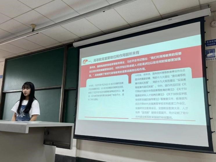 活动开始,陈静同志以带领大家观看了视频《奋进在不可逆转的复兴进程上》,感受中国的十年砥砺奋进、十年伟大变革。视频结束后,通过提问的方式,帮助同学们巩固和深化自身的理解。紧接着,陈静同志分别从16个方面具体介绍了中国10年来的历史性成就和历史性变革。着重介绍高等教育十年改革发展成效——高等教育规模大起来了、高等教育实力强起来了、高等教育培养质量高起来了、高等教育结构优起来了、党对高校的全面领导硬起来了。