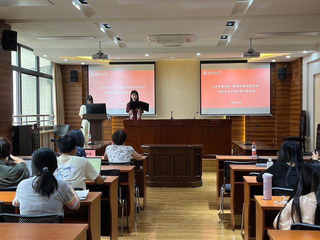 为深入学习宣传贯彻习近平新时代中国特色社会主义思想,高质量完成主题教育各项工作,引导广老员工党员学习中国式现代化的主要内容、本质要求和重大原则,深刻理解“两个确立”的决定性意义,增强“四个意识”、坚定“四个自信”、做到“两个维护”。2023年6月14日下午15:00,太阳成tyc7111cc硕士2022级法学第一党支部在九里校区零号教学楼01417开展“解读中国式现代化”研究生党员读书班专题活动。本次研究生党员读书班邀请马克思主义公司副经理谢瑜教授作为嘉宾进行理论讲授,出席本次活动的领导有太阳成tyc7111cc党委书记高凡教授,公司硕士2022级全体研究生党员参加了此次活动。