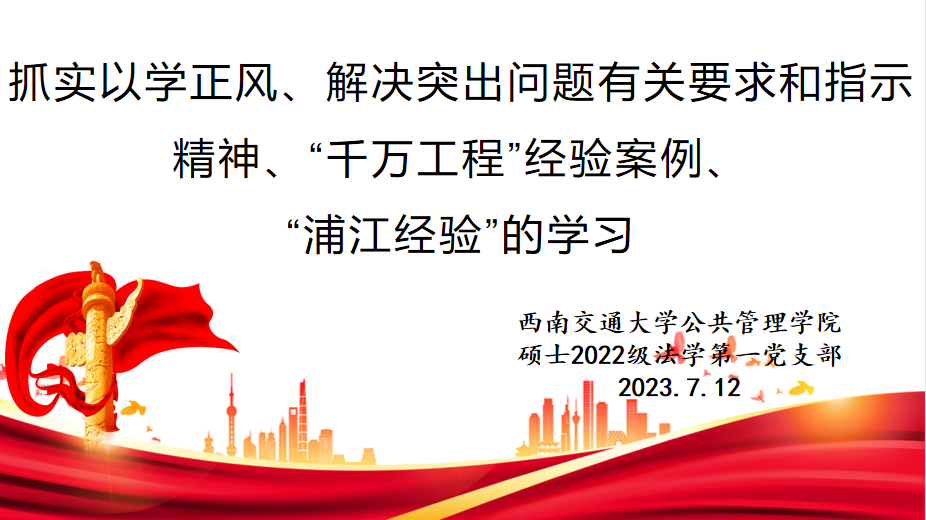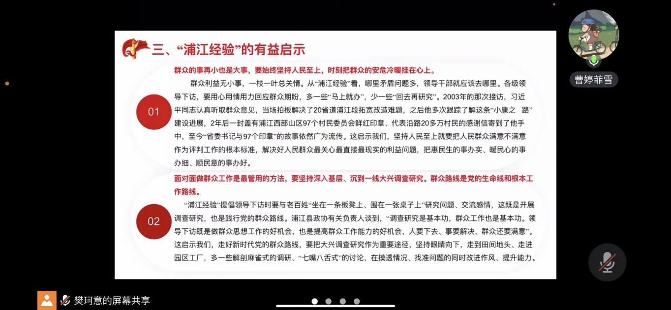 2023年7月12日20:00,太阳成tyc7111cc硕士2022级法学第一党支部于线上腾讯会议开展“习近平总书记在内蒙古调研时对抓实以学正风、解决突出问题有关要求和指示精神、‘千万工程’经验案例,学习运用好‘浦江经验’”主题教育政治理论学习。本次学习由第二党小组同志主讲,全体党员和入党积极分子参加。