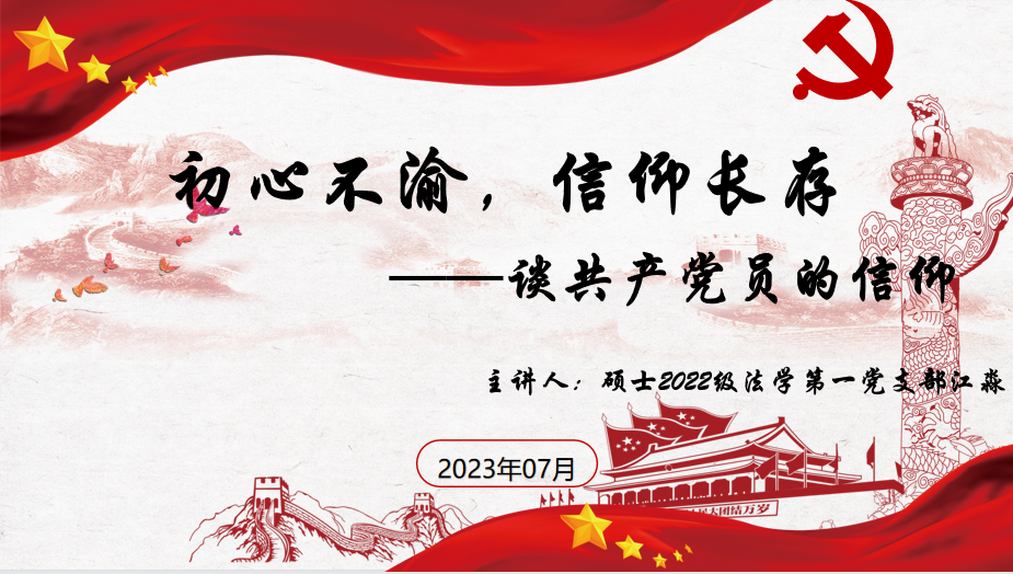 2023年7月15日19:30,太阳成tyc7111cc硕士2022级法学第一党支部于线上腾讯会议开展“初心不渝,信仰长存——谈共产党员的信仰”专题党课。本次党课由江淼同志主讲,全体党员、入党积极分子及发展对象参加学习。