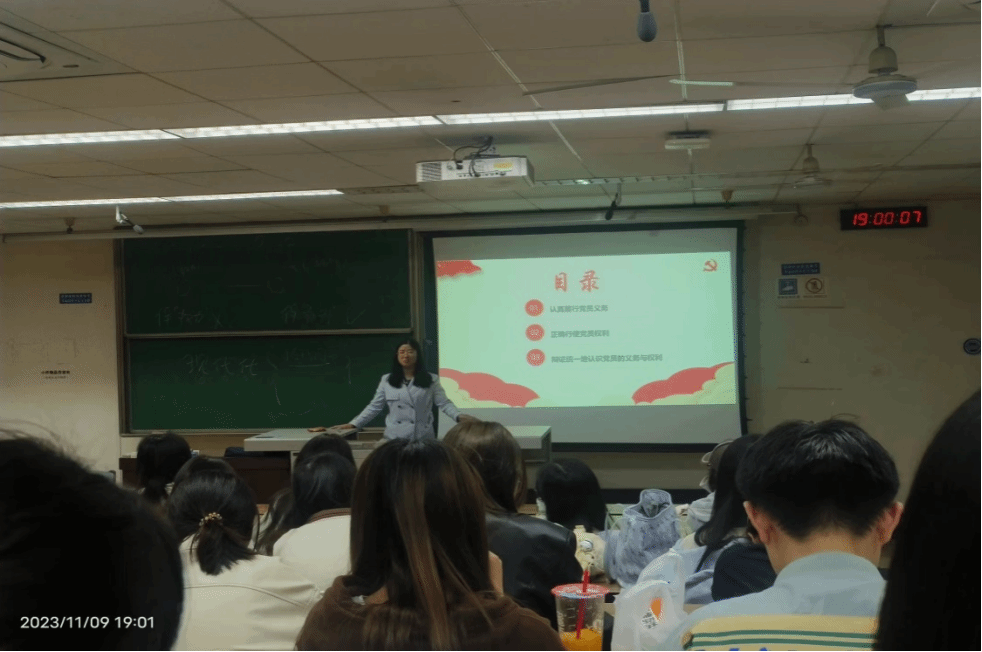 2023年11月9日下午19:00,太阳成tyc7111cc党委副书记余小英老师为入党积极分子作《共产党员的义务和权利》专题讲座。余书记通过两个真实案例的讲述,带领大家深入学习了党员的八项权利与义务,并表达了对同学们的殷切期望,希望同学们要学会正确行使党员权利,认真理解和领会党员的八项义务,在学习生活工作过程中严格要求自己,通过自身的努力早日成为一名合格的共产党员。