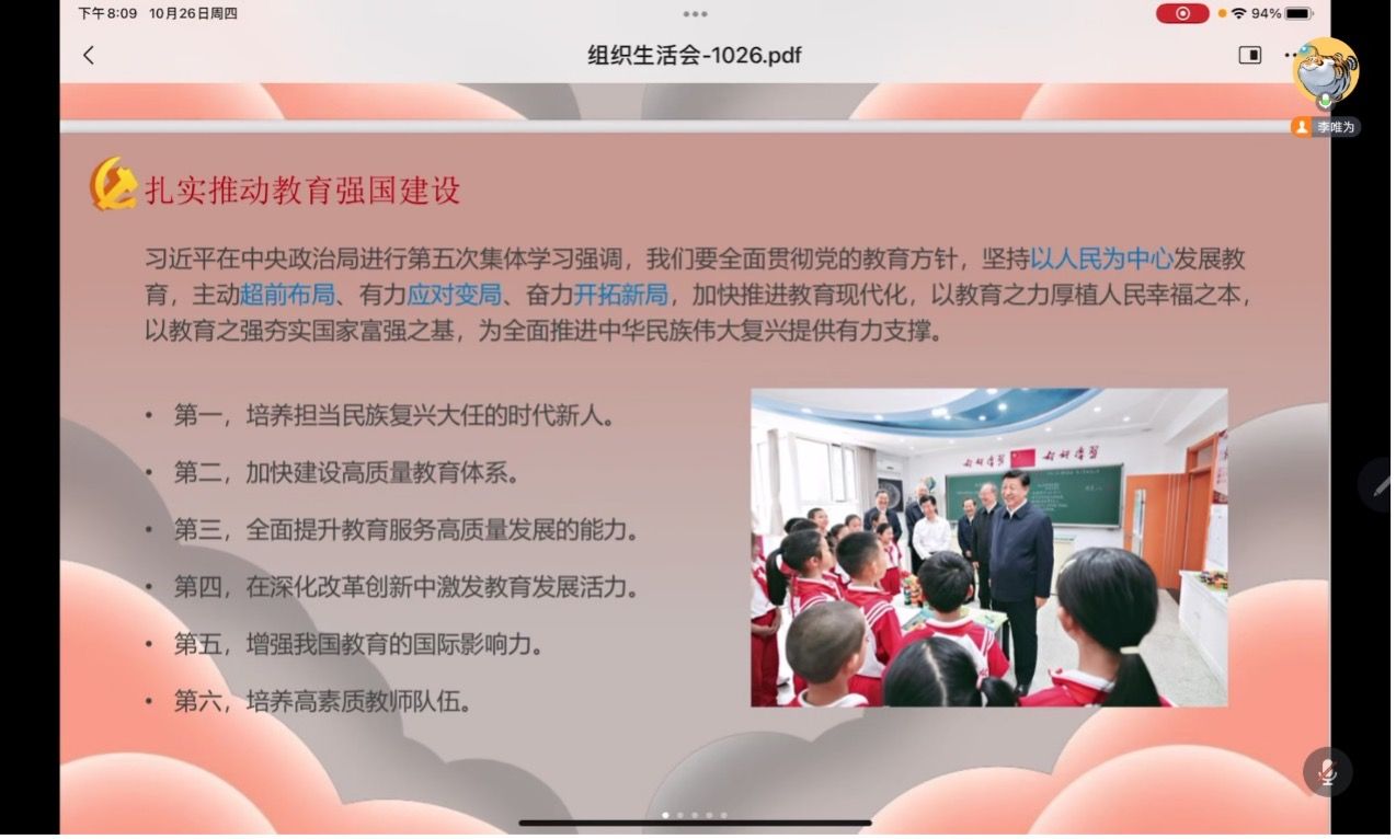 为深入开展学习贯彻习近平新时代中国特色社会主义思想主题教育,贯彻落实党的二十大精神,本科公管党支部于2023年10月26日晚8点,在线上腾讯会议平台组织开展集体学习活动,内容围绕《中国共产党党员教育管理工作条例》《习近平在中共中央政治局第八次集体学习时强调积极参与世界贸易组织改革 提高驾驭高水平对外开放能力》。本次学习活动由支部书记李唯为同志主持,支部宣传委员刘佳同志领学,全体本科公管党支部成员参与。