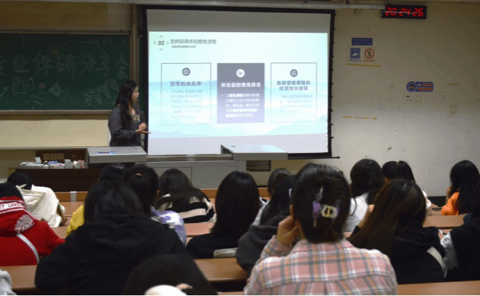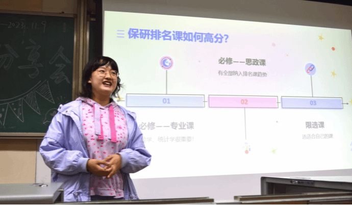 潘佳萱和冯锦两位同志认为成绩绩点是关键,学科竞赛和科研是锦上添花,其中公管专业的高数线代,统计学等都非常重要;尹丽颖同志亦认为专业核心课例如线代、矛盾论等非常重要,同时告诉同学们要学习好英语,打好英语基础;杨溢同志跨保到了行政管理专业,她拿自身举例,鼓励同学不要因为大一的失败或者是落后而放弃自己,要对未来充满希望,脚踏实地;她们都为同学们提供了清晰的择校和报考流程,告诉了同学们一系列的相关注意事项。