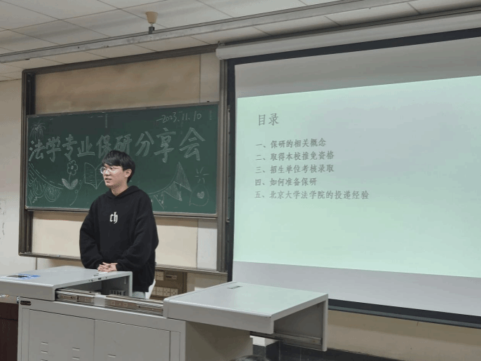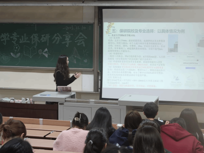 韩蒙恩同志首先为同学们讲述了保研的真正概念和含义,其次对如何取得本校保研资格以及如何准备保研进行了细致的分享,最后为同学们介绍了北大法公司的投递经验。