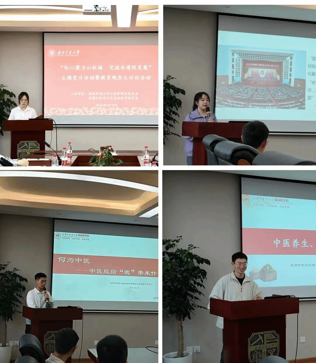 为深入学习贯彻习近平新时代中国特色社会主义思想,落实习近平总书记关于发展新质生产力的重要论述,弘扬中华优秀传统文化,2024年4月18日下午,公司党委与成都中医药大学基础医公司党委在公司九里校区01416会议室联合开展“红心聚力沁校园,交流共建促发展”主题党日活动暨教育观念大讨论活动。公司党委书记高凡,成都中医药大学基础医公司党委书记刘世云,基础医公司党委副书记、纪委书记周仕轶,公司专职组织员邓改娥及两院员工辅导员、40余师生党员代表参加本次活动。