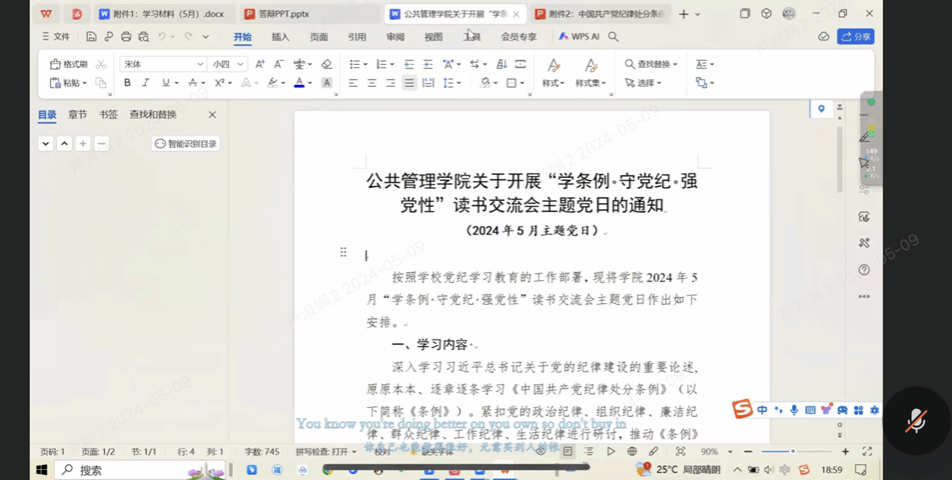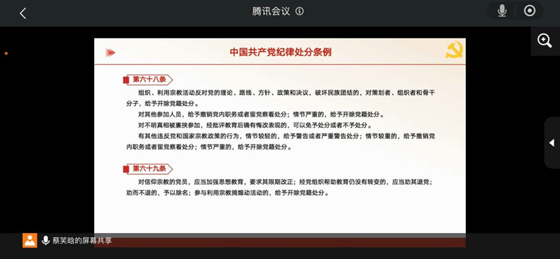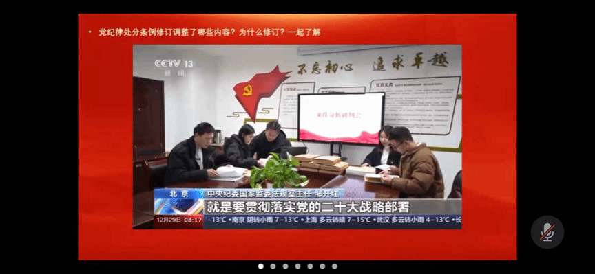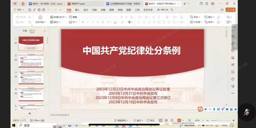 5月9日,本科公管党支部在党支部书记李唯为同志的带领下,回顾了《中国共产党纪律处分条例》修改的重大历史意义和现实意义,从篇章结构的角度对《条例》基本框架和主要内容进行梳理,并通过观看《新闻联播》《朝闻天下》等新闻片段,进一步加深对相关知识的理解与运用。