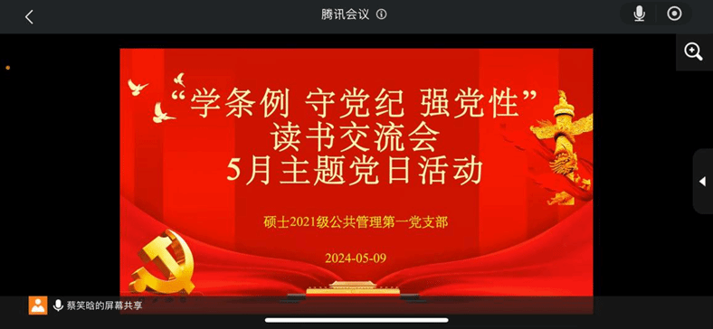 5月11日,硕士2021级公共管理第二党支部全体党员进行学习。党支部书记疏金金同志阐述了学习党的纪律条例、遵守党的纪律、加强党性修养的重要性与紧迫性。他强调,作为新时代的共产党员,我们必须时刻保持清醒的头脑,增强政治敏锐性和政治鉴别力,不断提高自己的党性修养和纪律意识。他号召全体党员要以此次读书交流会为契机,深入学习党的纪律要求,切实增强纪律意识,筑牢思想防线。