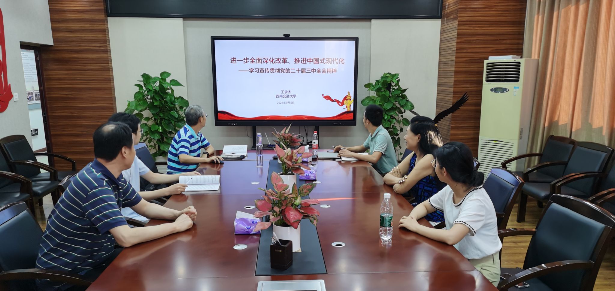 为了学习贯彻党的二十届三中全会精神,2024年9月5日下午16:30,公司教工应急管理研究中心党支部于J01212会议室开展主题党日理论学习活动。本次学习活动由公司经理、中心党支部书记王永杰作《进一步全面深化改革、推进中国式现代化—学习贯彻党的二十届三中全会精神》的专题分享,中心全体成员参与本次专题理论学习。