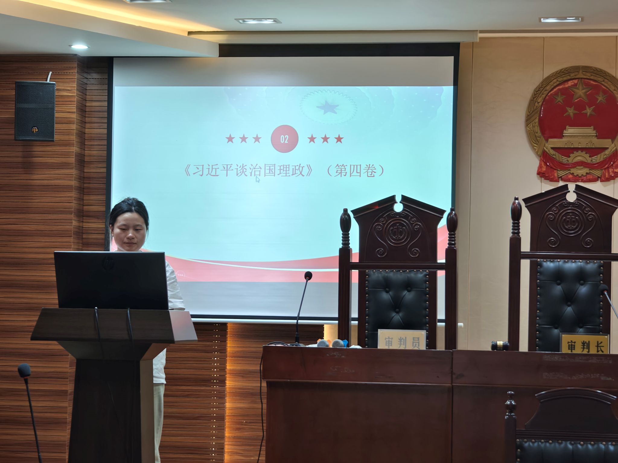 本次活动共分为两项议程。首先由党支部组织委员钟露瑶同志上台作读书分享。钟露瑶同志分别为全体参会成员分享了《红岩》《习近平谈治国理政》第四卷以及《保卫延安》这三本红色经典著作。钟露瑶同志从书籍的主要内容和意义出发,重点介绍了这些书籍在当下的时代内涵和精神价值,参会成员均深受启发。