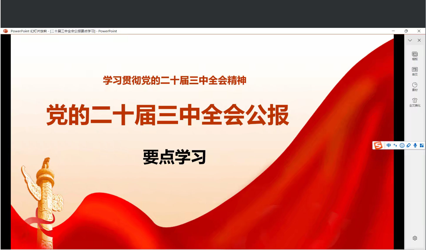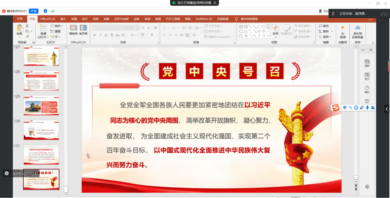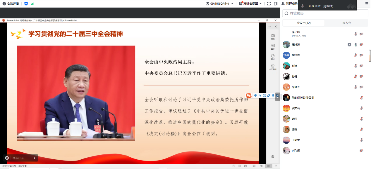 最后,由党支部纪检委员庞鸿源同志为全体参会成员作了关于党的二十届三中全会精神的重点解读报告。庞鸿源同志提纲挈领式地带领大家回顾了改革开放以来党的历届三中全会的简要历史、主要议题和重大政治意义,强调要突出政治站位,充分学习领会本次全会对新时代治国理政和改革开放事业的极端重要性。