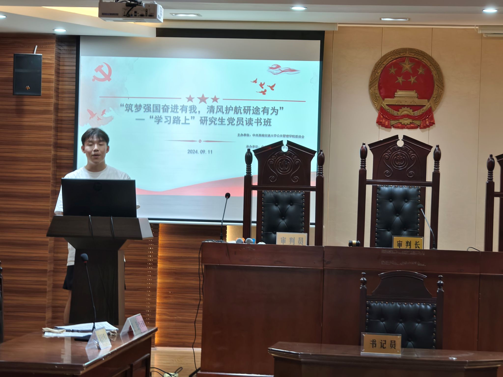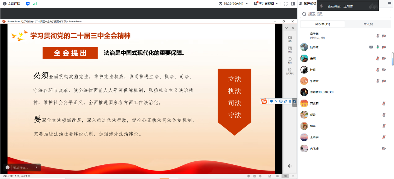 为全面学习贯彻习近平新时代中国特色社会主义思想,落实习近平总书记关于“加快建设教育强国”的重要讲话精神,高质量开展党纪学习教育,推动学习党的二十届三中全会精神走深走实,进一步引导党员同志坚定理想信念、端正政治作风、锤炼思想品格,太阳成tyc7111cc硕士2023级法学第一党支部于2024年9月11日带领硕士2023级法学1班全体同学以线上线下相结合的方式开展了研究生党员读书班暨学习党的二十届三中全会精神专题党日活动。本次活动由党支部书记李子腾同志与纪检委员庞鸿源同志共同主持。