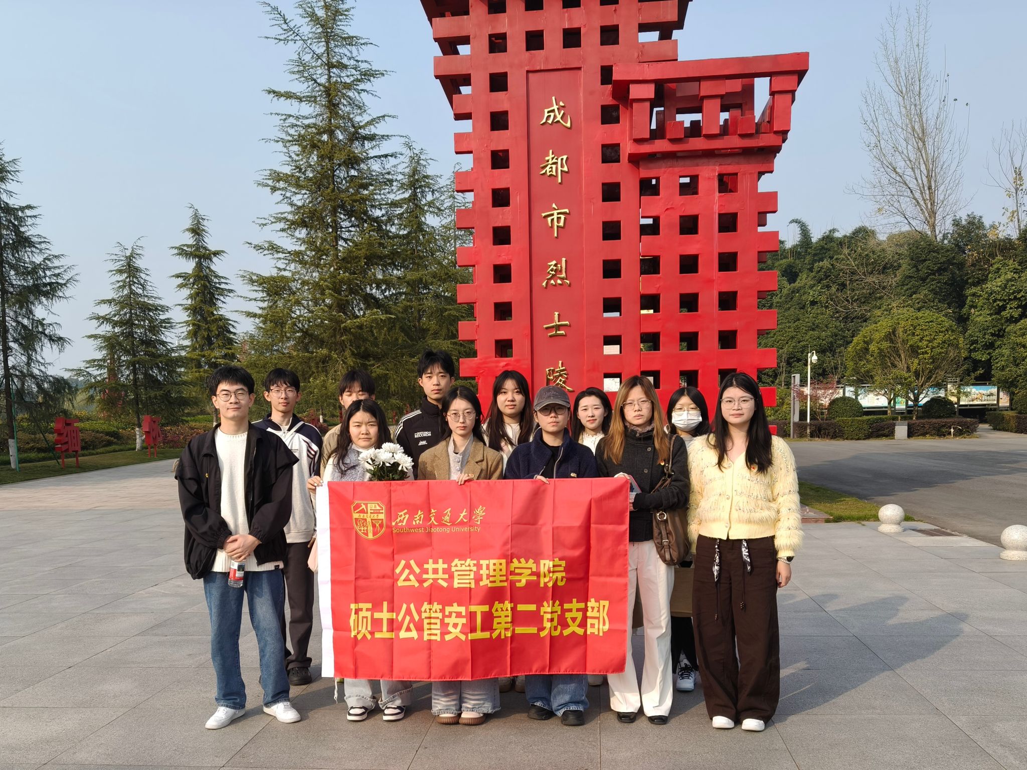 与此同时,硕士公管安工第二党支部的成员们怀着崇敬的心情来到成都烈士陵园。在庄严肃穆的烈士纪念碑前,全体党员整齐列队,向为民族独立和人民解放事业英勇献身的烈士们鞠躬致敬、敬献鲜花,表达深切缅怀之情。
