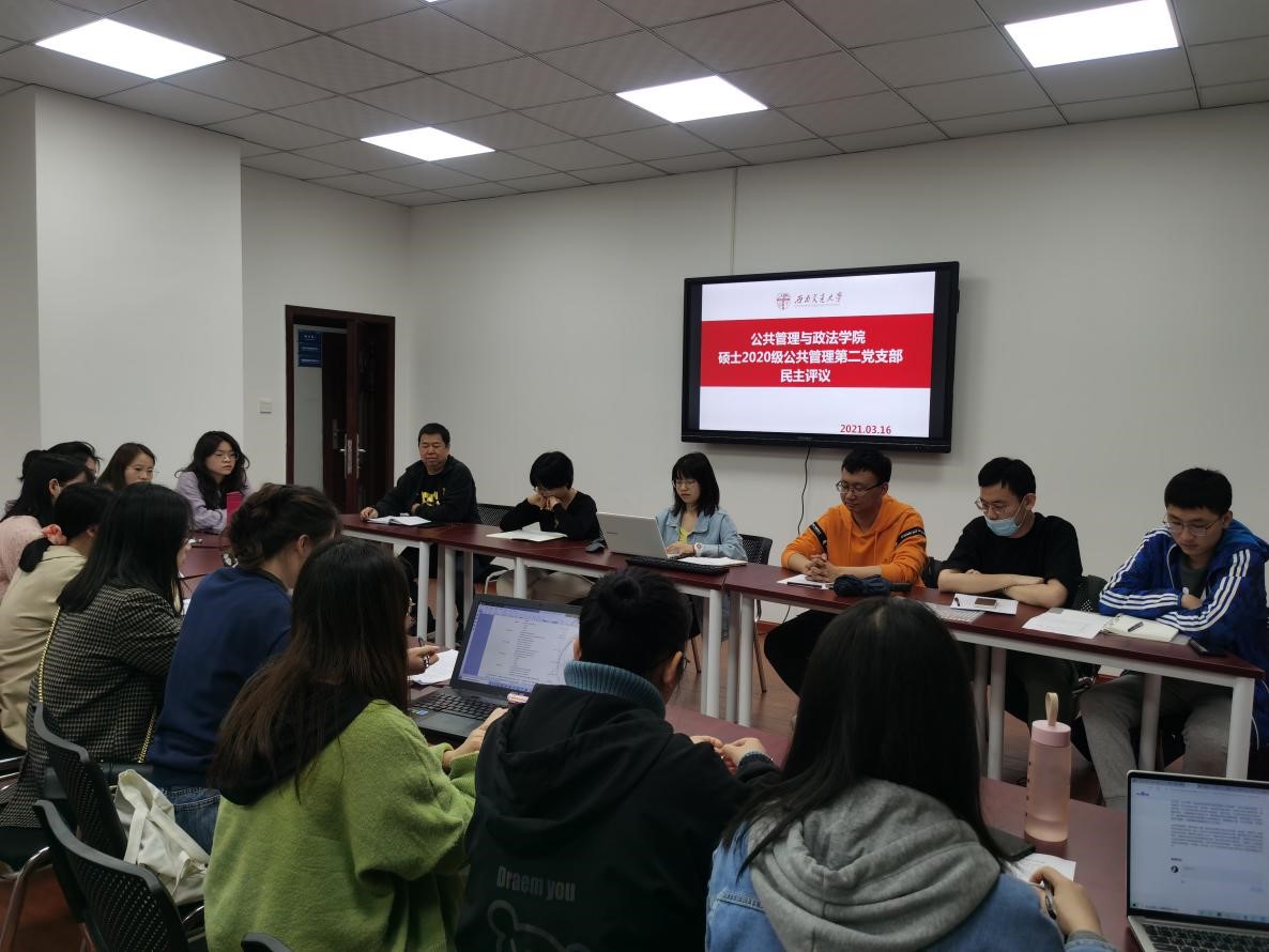 2021年3月16日19:30,公共管理与政法公司硕士2020级公共管理第二党支部于九里校区01108开展了“学习习近平在全国劳动模范和先进工作者表彰大会上的讲话”专题组织生活会并进行了党员民主评议。参加本次会议的有:公司副经理雷叙川及支部全体党员同志。