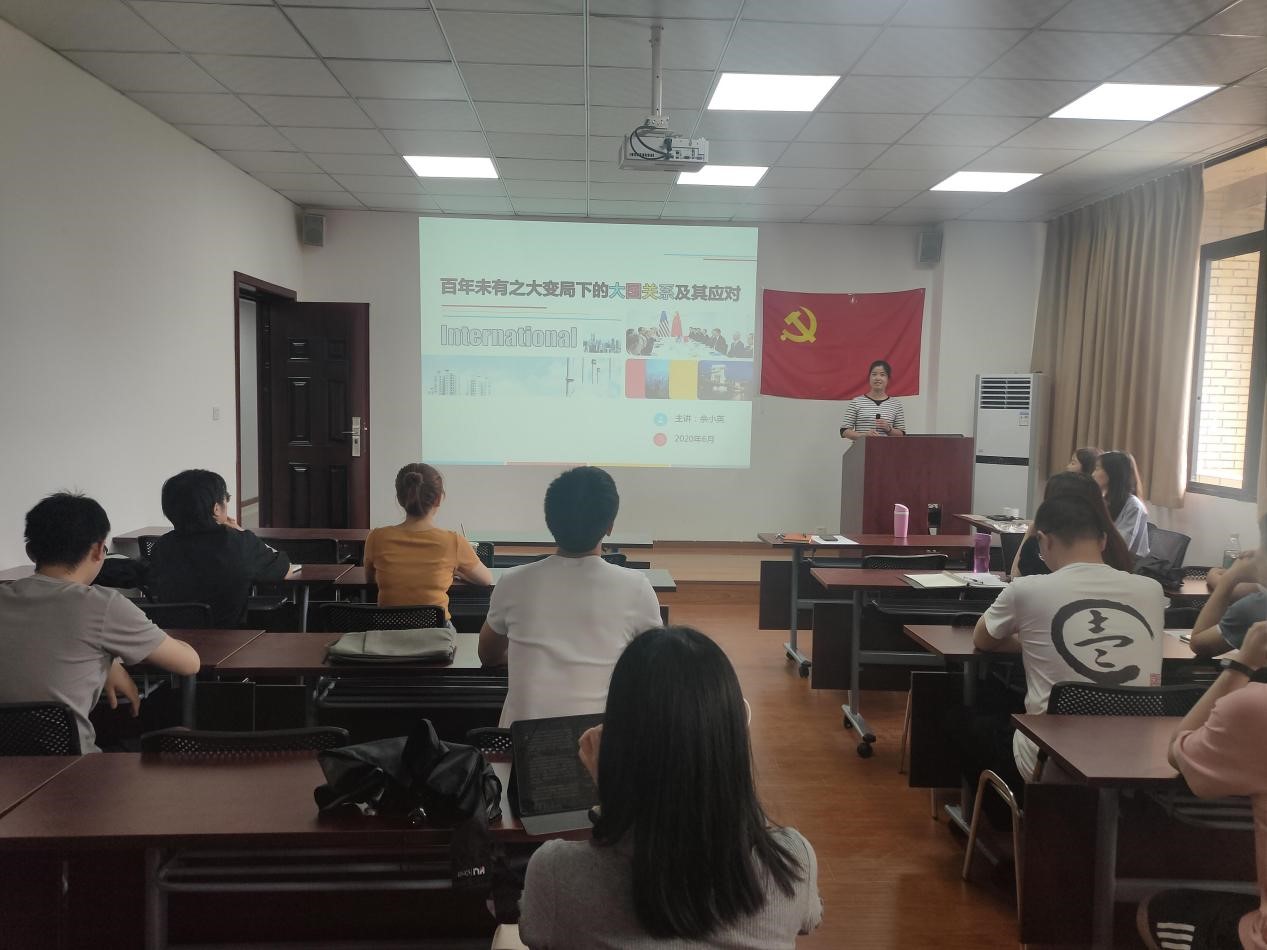 今年是中国共产党建党100周年,为加强党史学习教育,弘扬红色精神,全面认识中国共产党历史,进一步落实相关精神指示,硕士2020级法学第一党支部于2021年6月17日14:30,在太阳成tyc7111cc九里校区零号楼1103开展以“百年未有之大变局下的大国关系及其应对”为主题的党课教育活动,本次活动由公司党委副书记余小英老师主讲,党支部书记肖秋月同志主持,支部全体成员参加此次会议。