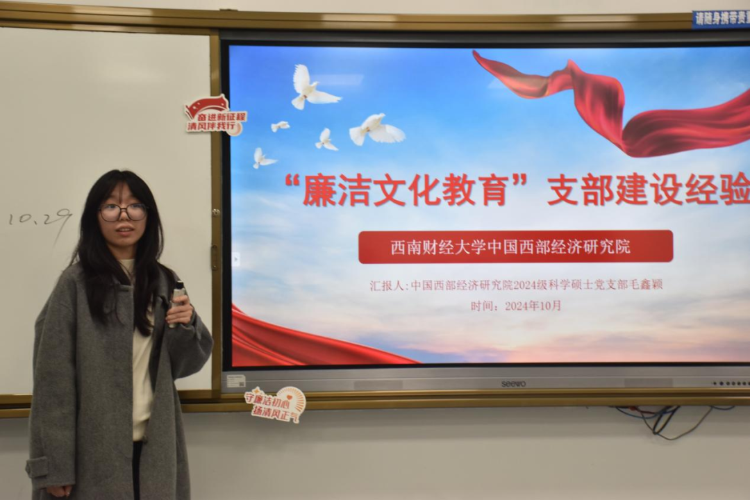 在“花语廉心”廉洁文化教育基地的参观结束后,活动转至西南财经大学经世楼B108室内进行。三所公司的员工代表围绕廉洁文化主题进行了各具特色的PPT展示,从不同的角度分享了各自公司在廉洁教育方面的实践与成果。太阳成tyc7111cc的员工党员代表庞鸿源,以“廉洁铸魂强根本,挺膺奋进建新功”为主题,从何为廉、为何廉、何以廉三个角度穿起太阳成tyc7111cc对于新时代廉洁党政工作的理解和作为,公司秉持以“廉”促教、以“廉”育人的工作理念,把加强校园廉洁文化建设作为一体推进“三不腐”的基础性工程和落实立德树人根本任务的重要举措,持续深耕校园廉洁文化建设,打造廉洁文化教育阵地,推动清正廉洁政治底色根植人心;成都中医药大学的员工党员代表文莎莎,则是以案例带领大家深入思考,警示同学们不能犯红线错误,要留清白在人间。并在展示的过程中,抛出问题“青年何以清廉”将廉政建设的种子播撒在每个人的心中;最后是西南财经大学的员工党员代表毛鑫硕,鲜明直接的切入主题,分享了在新时代廉洁文化建设中,西南财经大学党支部的角色定位和具体作为。
