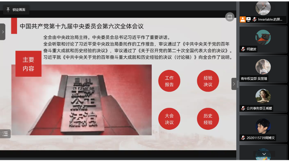 在线上会议的共同讨论中,各位成员各抒己见,最终通过思想的交流碰撞,在三个“需要”、两个“确立”、五大“历史意义”、十个“坚持”、一个“根本问题”、四个“必须”、一次“十分重要的代表大会”、一个“号召”这八个数字的指引下,进一步了解党带领人民筚路蓝缕、奠基立业的一百年奋斗历程,坚定了“听党话,跟党走”的信心和决心。